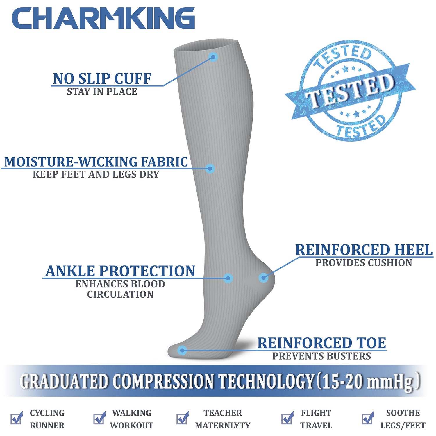 - COMFORTABLE MATERIAL AND CAREFUL CONSTRUCTION - CHARMKING knee high compression socks' material are upgraded with nylon percentage from 40% to 85%, Delivers 360-degree stretch for greater flexibility and durability. Breathable high performance fabric keeps an optimal temperature. We are confident that you will choose it!