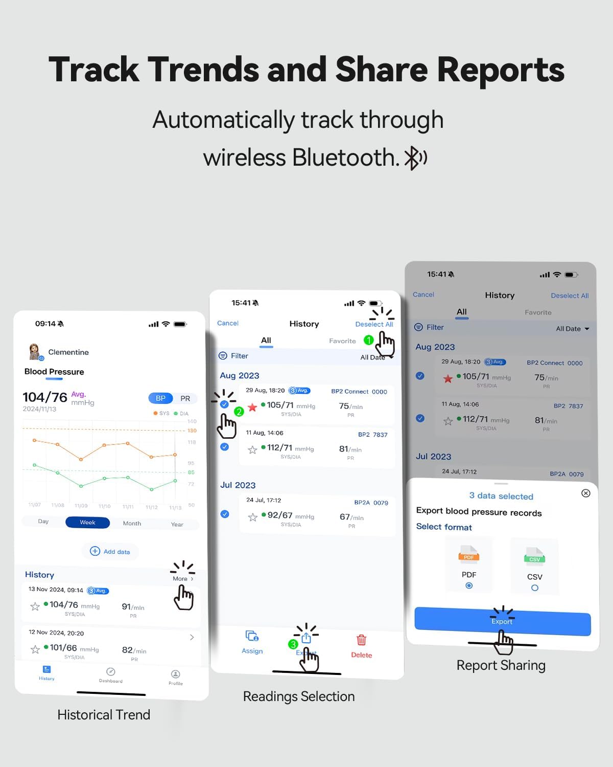 - 【BUILT-IN BLUETOOTH】- Multi-user record management on ViHealth app. Free to access, review and share records & reports (PDF & CSV) on your iOS or Android