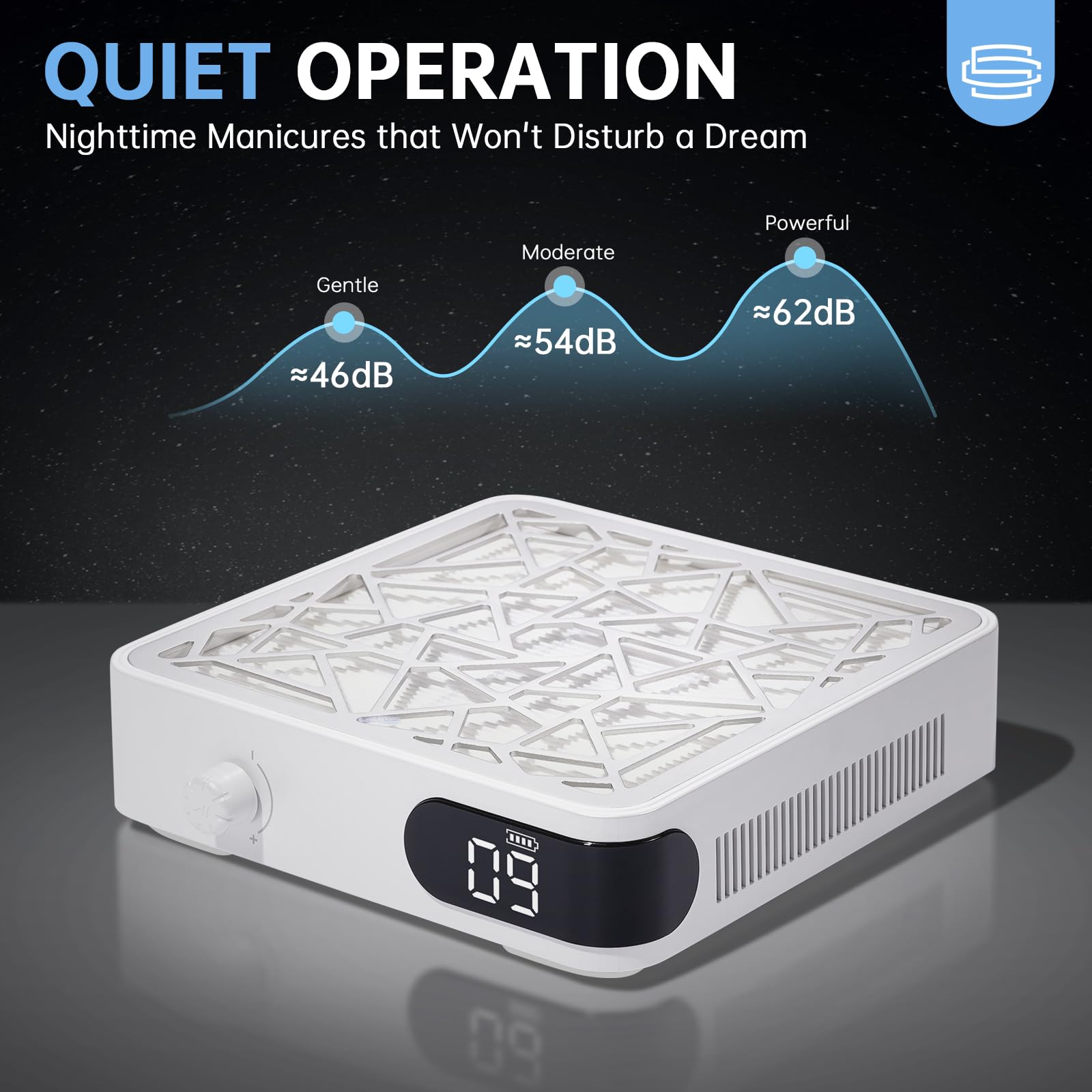 - Low Noise & Adjustable Suction: With a high-quality brushless turbo suction motor, this nail dust vacuum machine will keep in low noise, makes you more comfortable while filing. Adjust suction as you please for optimal results.