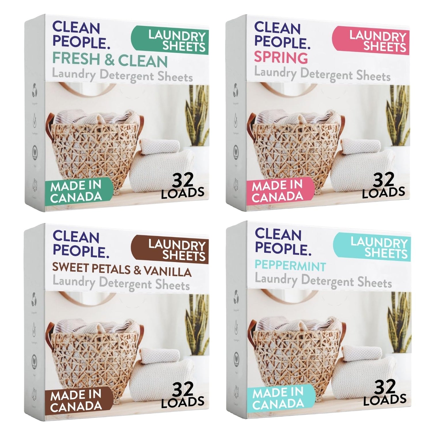 Clean People Laundry Detergent Sheets- Recyclable Packaging, Hypoallergenic, Stain Fighting, Works with All Machines including HE (128 Count, Variety Pack)