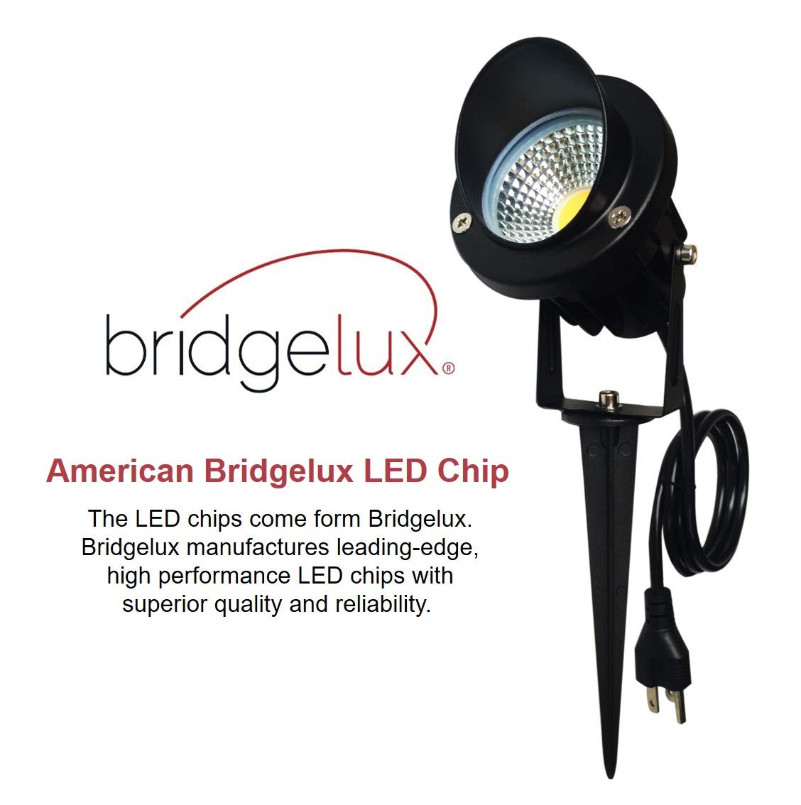 - Durable and easy to use-- ALL Metal lamp body and large Cooling Fin, more strong and sturdy than plastic body; IP65 waterproof design; 110V/120V with plug, 5ft cord and metal stake. Plug and play. One-year warr-anty.