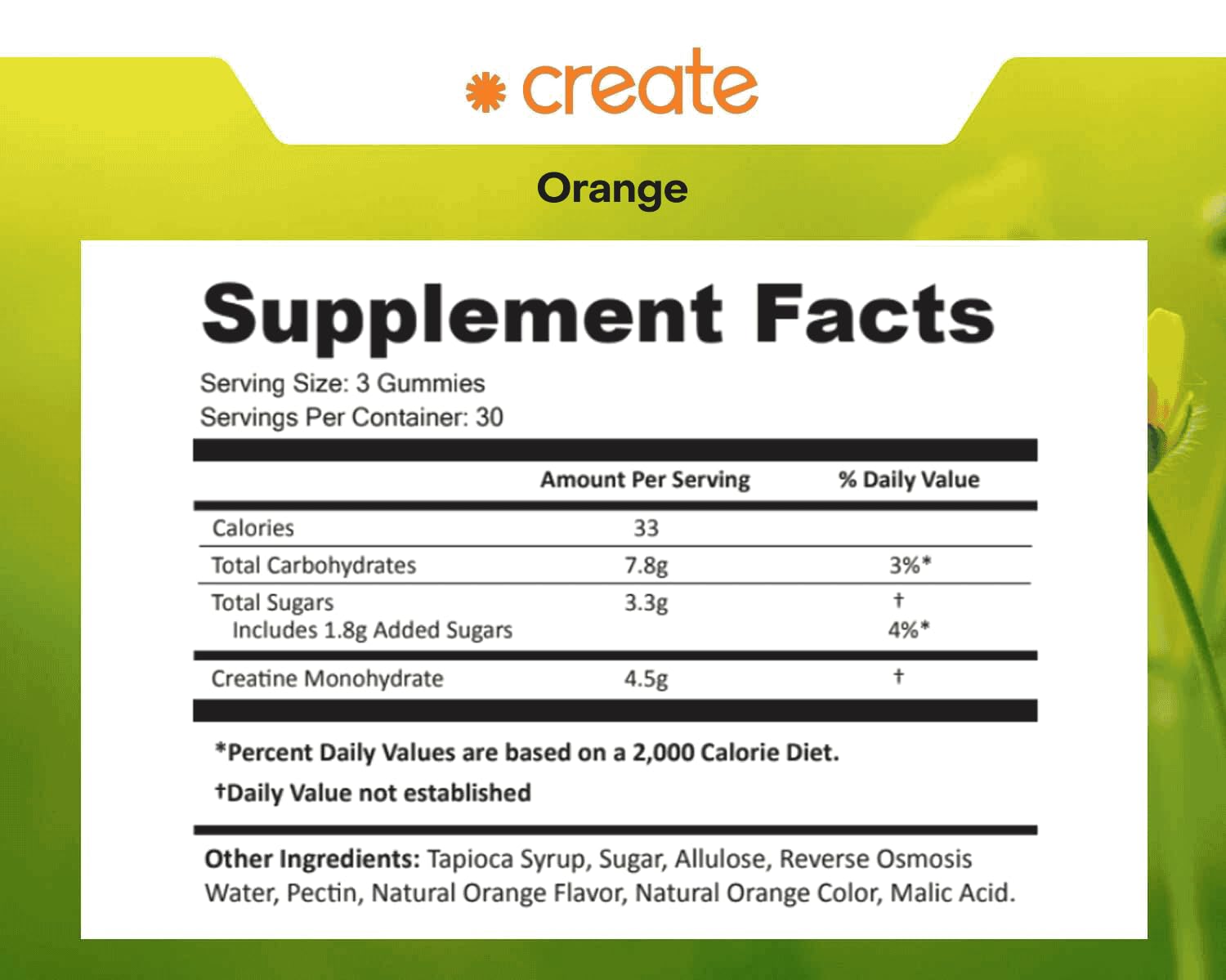 Create Creatine Monohydrate Gummies for Men & Women, Boost Focus, Strength, and Endurance, Anti-Melting Formula, Vegan, Gluten-Free, Non-GMO, 1.5g of Creatine per Gummy (Orange, 90 ct)