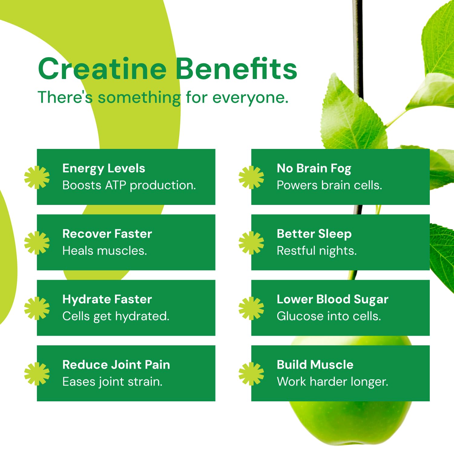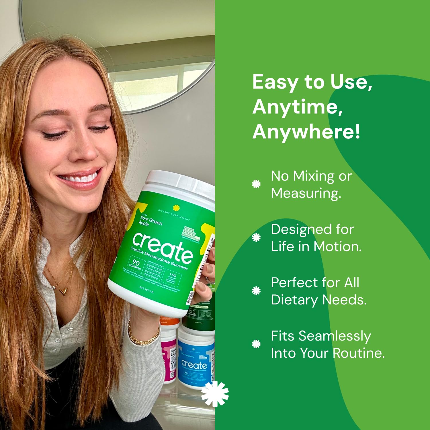 - CONVENIENT & DELICIOUS: Say goodbye to messy powders and bland supplements. Our refreshing sour green apple flavor makes every gummy an indulgence. With 1.5g creatine per gummy, enjoy ultimate convenience and performance benefits in every bite.