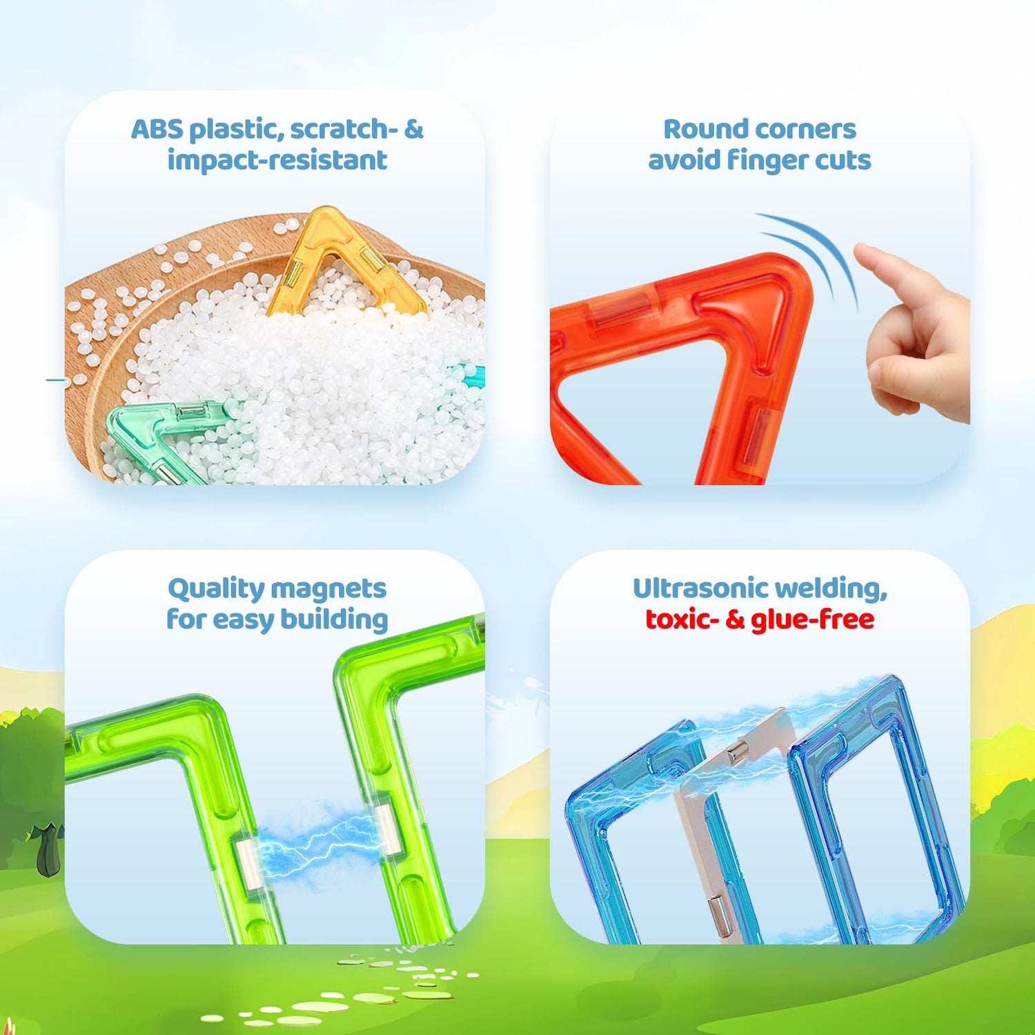 - 【Parents’ 1st Choice】Each tile is composed of scratch-resistant ABS plastic and top-tier magnets. Ultrasonic welding technology ensures tight seals for long-lasting use. Meticulous details, such as smooth surface and round corners, keep small hands safe from cuts.
