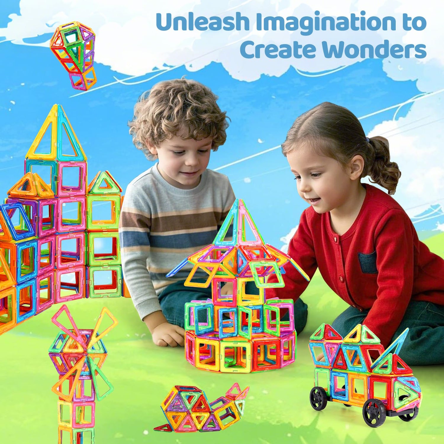 - 【Fun Activity】Exploring more entertaining options with Crenova magnetic tiles! Included 2 car wheel sets and 5 different geometric magnetic shapes, this toy allows for flexible building possibilities from 2D to 3D objects, e.g. truck, train, and car robot. It sparks imagination and creativity in kids with never-ending fun, preventing digital eye strain as well.