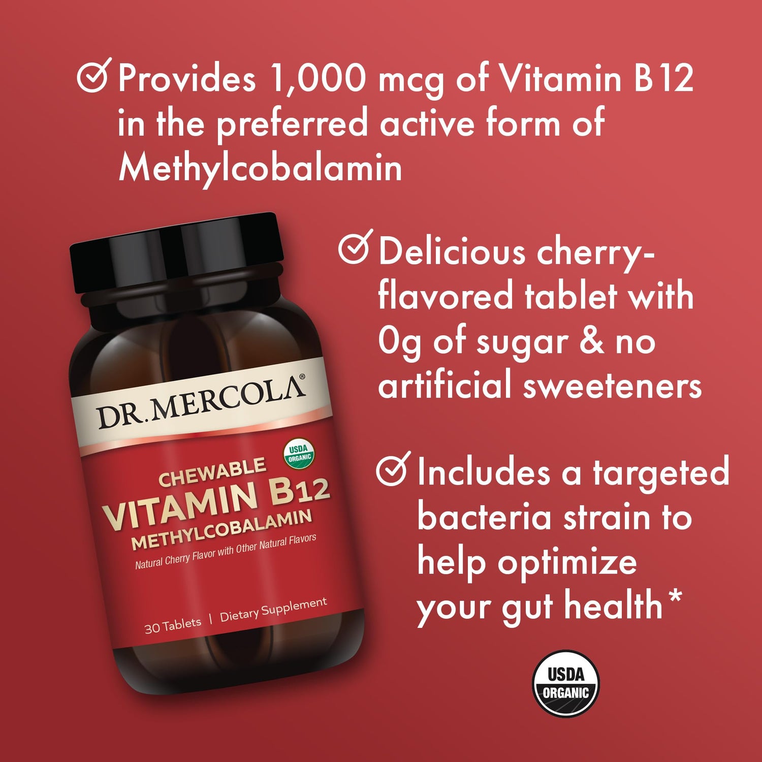 Dr. Mercola Organic Chewable Vitamin B12, 30 Servings (30 Tablets), Natural Cherry Flavor, Dietary Supplement, Supports Energy Production and Mental Focus, Non-GMO, Certified USDA Organic