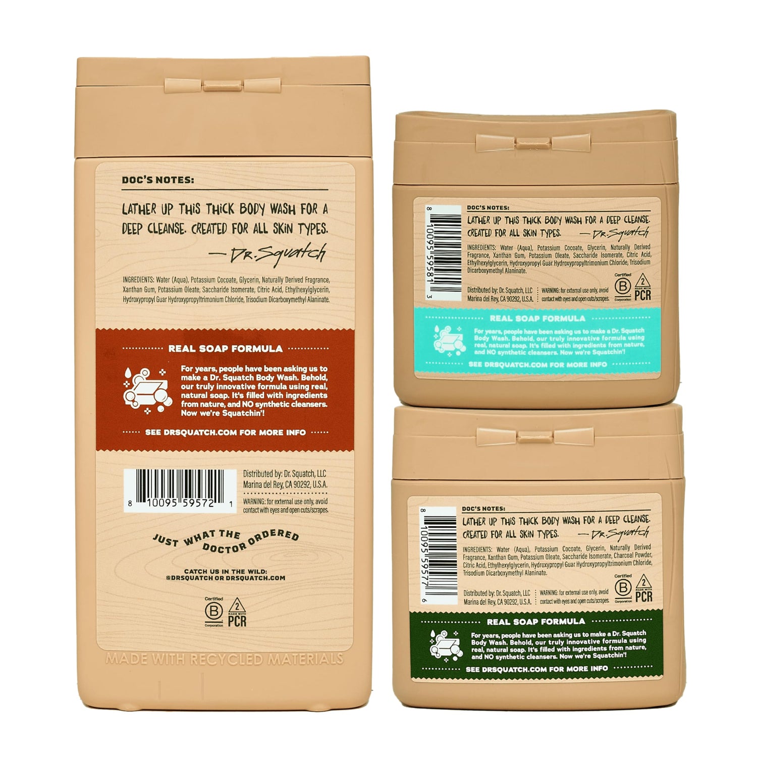 Dr. Squatch NEW Body Wash for Men with Nourishing, Natural Ingredients | No Paraben, Phthalate, Sulfate | Wood Barrel Bourbon (14 oz), Coconut Castaway & Pine Tar (8 oz, 2-Pack) & Body Scrubber is backordered and will ship as soon as it is back in stock.
