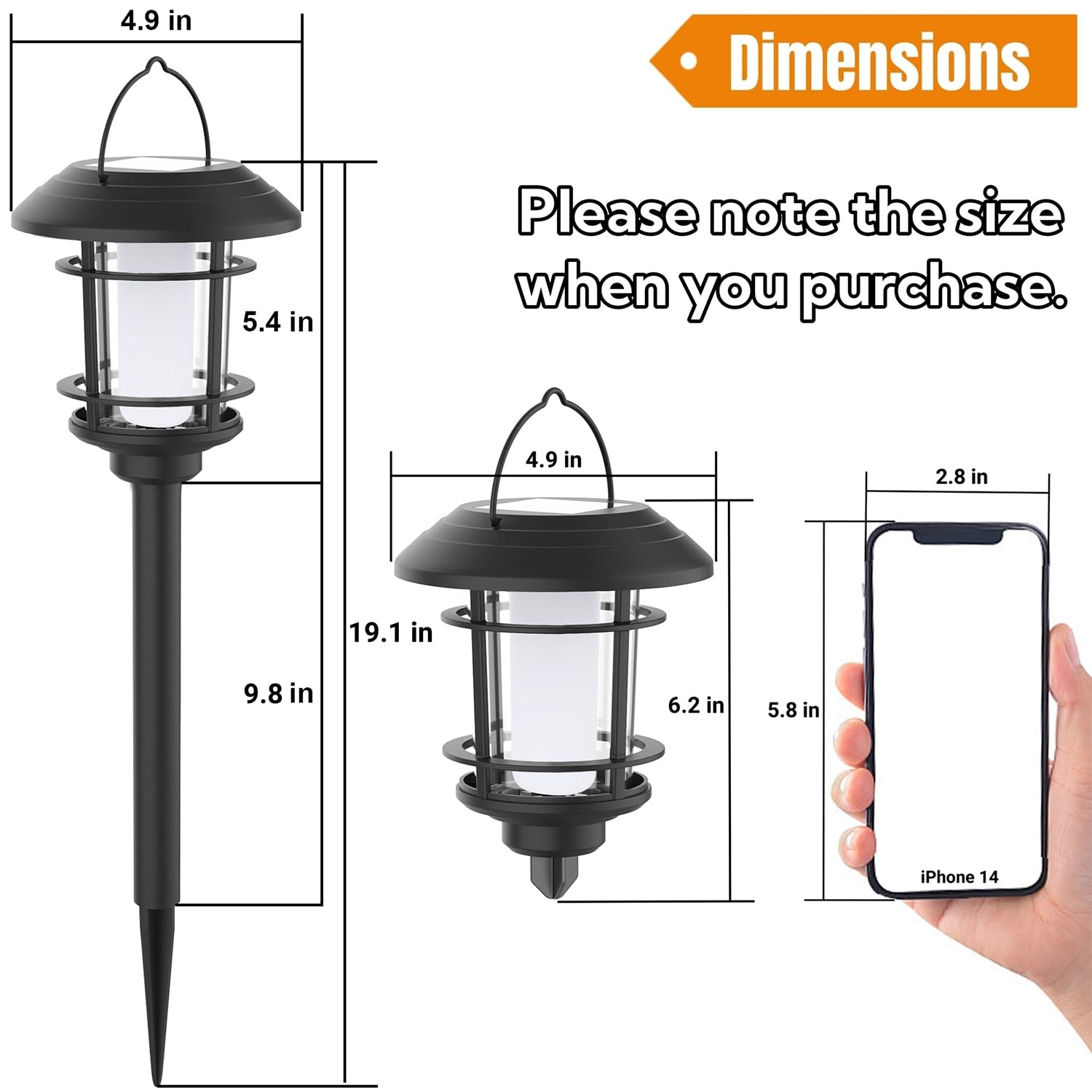 - HANGING LANTERN LIGHTS: Our solar lights equipped with a metal hook, so you can not only stake it on the ground as pathway lights, but also hang it on a shepherds hook as a wall lights. Please note that our solar hanging lanterns are designed for outdoor decoration, maybe not bright enough, but the light is soft and gentle. Lantern Size- 4.9 x 4.9 x 6.2 inches