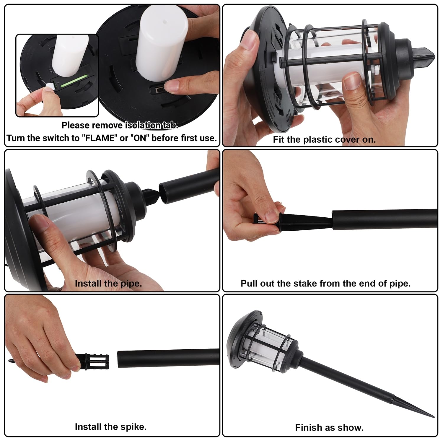 - FLICKERING FLAME TORCH LIGHTS: Connect the light, pole and stake(inside the pole), insert the stakes into the soft soil or ground where there has direct sunlight. Solar LED flickering flameless garden pathway lights, add a 360 degree viewing angle illuminate charming to your garden, decorate your fence, deck, porch or yard. Size with Stake- 4.9 x 4.9 x 19.1 inches