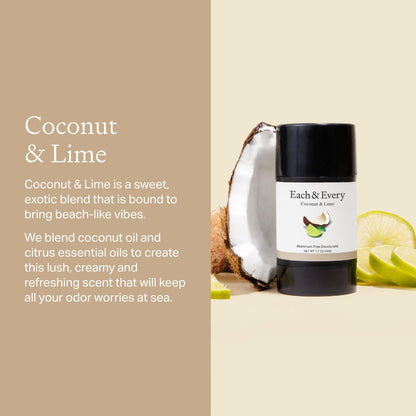 - Coconut and Lime - This lush, creamy scent comes from refreshing coconut oil and citrus essential oils. Plush tapioca starch and conditioning coconut oil also give this sensitive skin deodorant a smooth glide.
