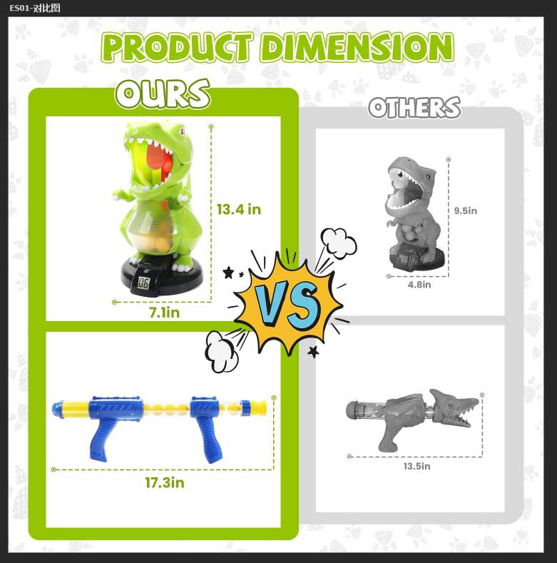 - 【Large Dino Shooting Boy Toys】 Electric Scoring Target (7.1″*7.1″13.4″) is a perfect addition to kids' growing armory. Equipped with 1 dinosaur shooting target, 24 foam balls, 1 air pump gun, this dinosaur toy not only can be used as a collection but also kids could use it as a toy foam guns.