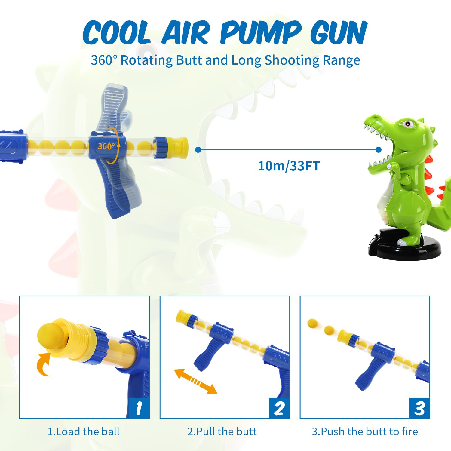 - 【Cool Pump Action Gun & Safe Balls】The power popper toy gun has 360°butt and shoots over 33 ft. The foam balls are made of EVA foam, which is very light, safe and harmless. The balls can be collected inside the dinosaur's belly. Easy to take out from the tail for recycling. No harm to anyone or anything else it shoot.