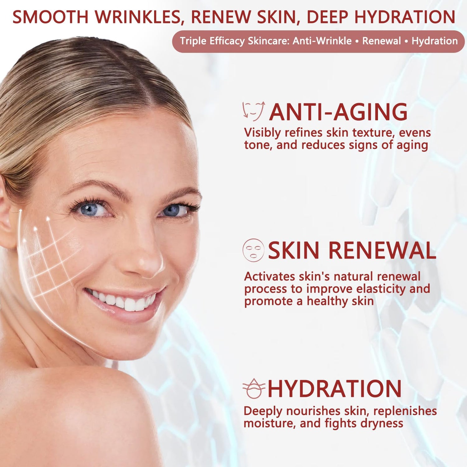 - All in One Anti Aging Treatment :Promotes cell regeneration and repair,Anti-wrinkle, anti-oxidation, improve skin elasticity and order lines, absorb ultraviolet rays, improve skin wrinkles and sagging aging problems.