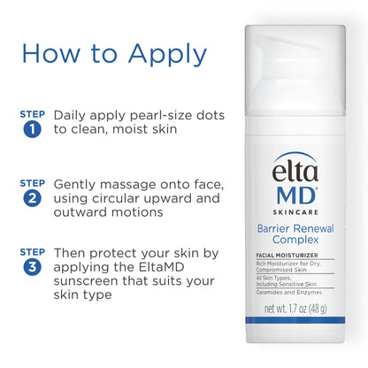 - IMPROVES DRY SKIN: EltaMD Barrier Renewal Complex facial moisturizer visibly improves dry skin's appearance after a single application within 24 hours, offering relief and hydration as a dry skin face moisturizer.