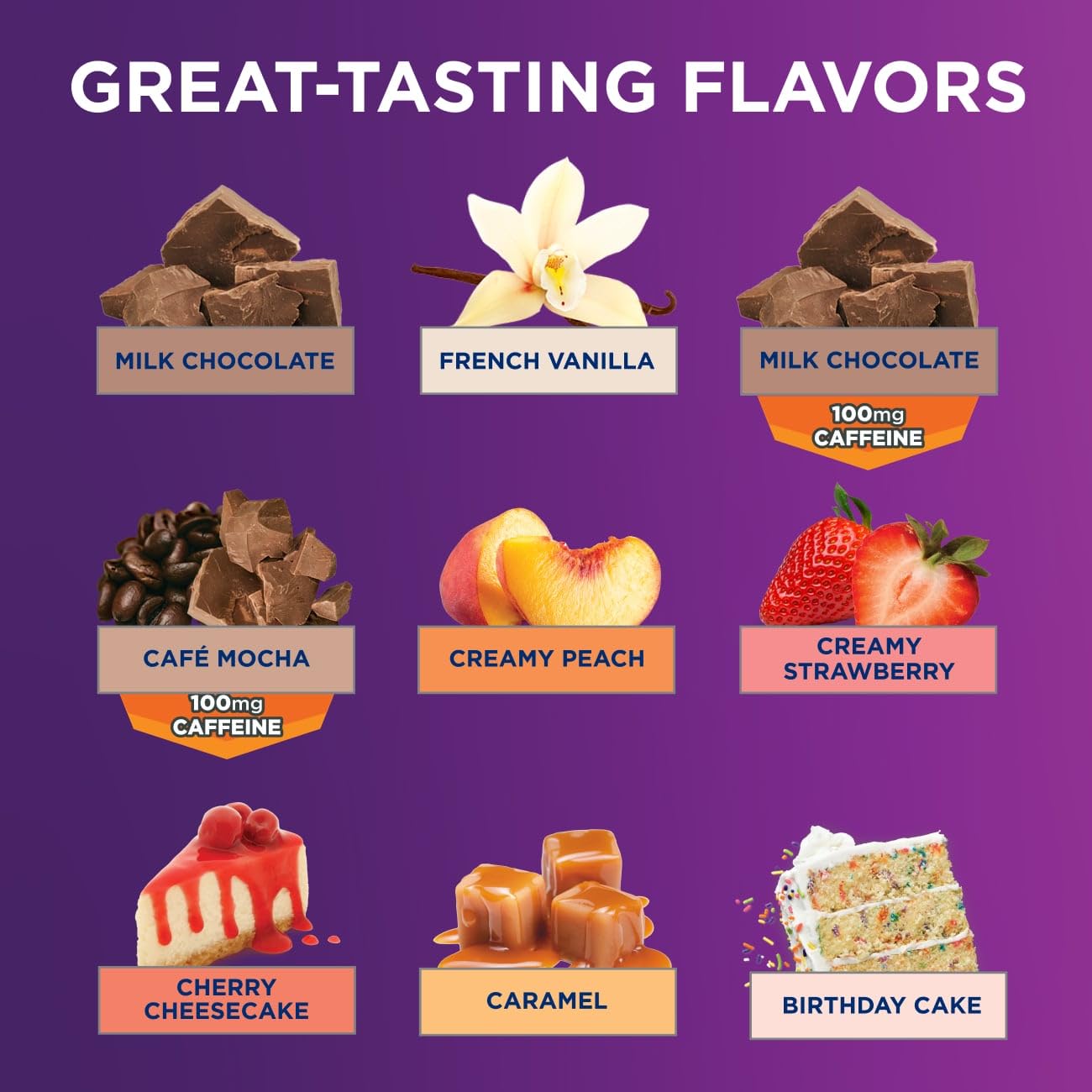Details: Ensure Max Protein shakes have 30g protein to feed muscles up to 7 hours.* These nutrition shakes have 25 essential vitamins and minerals, including antioxidants (vitamins C & E and selenium) to support immune health, calcium and vitamin D to support bone health, B12 and folate for brain health, and 8 essential B vitamins to support energy metabolism. Ensure Max Protein shakes also have 4g fiber with a prebiotic to support digestive health. Available in delicious flavors like French Vanilla, Milk Chocolate, Creamy Strawberry, Café Mocha, and more. Enjoy a nutrition shake after a workout, as a snack, or on the go. From Ensure, the #1 doctor-recommended brand.† This product is gluten-free and suitable for lactose intolerance.‡ * Fast- and slow-digesting protein. † Among doctors who recommend liquid nutritional products to their patients. ‡ Not for people with galactosemia. § Contains 100mg of caffeine—as much as one 8-fl-oz cup of coffee.