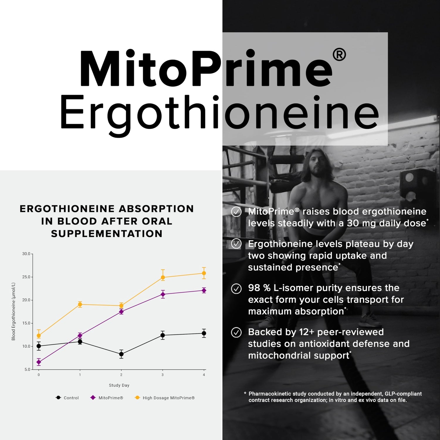 - Potent 30mg MitoPrime L-Ergothioneine per Capsule: Each capsule delivers 30mg of patented MitoPrime, a highly pure form of L-Ergothioneine shown in research to support antioxidant activity and cellular protection.