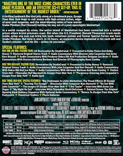 4K Restoration by StudioCanal Dolby Atmos Track Restored Original Stereo Track Audio Commentary with Director John Carpenter and Actor Kurt Russel Audio Commentary with Producer Debra Hill and Production Designer Joe Alves Audio Commentary with Actress Adrienne Barbeau and Director of Photography Dean Cundey Audio Commentary with Director John Carpenter and Actor Kurt Russell Audio Commentary with Producer Debra Hill and Production Desginer Joe Alves Audio Commentary with Actress Adrienne Barbeau and Director of Photography Dean Cudney Trailers from Hell - Filmmaker Neil Marshall on Escape From New York Purgatory: Entering John Carpenter's Escape From New York Radio Spot Big Challenges in Little Manhattan: The Visual Effects of Escape From New York Scoring the Escape - A Discussion with Composer Alan Howarth On Set with John Carpenter - The Images of Escape From New York with Photographer Kim Gottlieb-Walker I Am Taylor - An Interview with Actor Joe Unger My Night on Set - An Interview with Filmmaker David DeCoteau Deleted Scene: The Original Opening Bank Robbery Sequence with Optional Audio Commentary Return to Escape From New York Featurette Theatrical Trailers Photo Galleries - Behind-the-Scenes, Posters and Lobby Cards