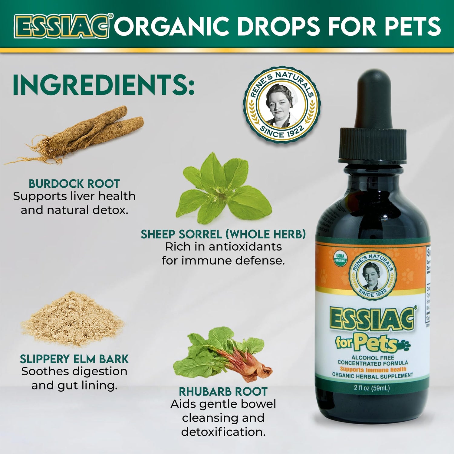 - USDA ORGANIC ESSIAC FOR DOGS AND CATS - The Classic Essiac herbal supplement formula is now available in a convenient concentrated daily drop meant for our beloved companions. The new plastic dropper format with graduated dosage pre-printed makes it easy to give and Alcohol Free. Each 2 fl oz. (59ml) bottle provides up to a 2-month supply.