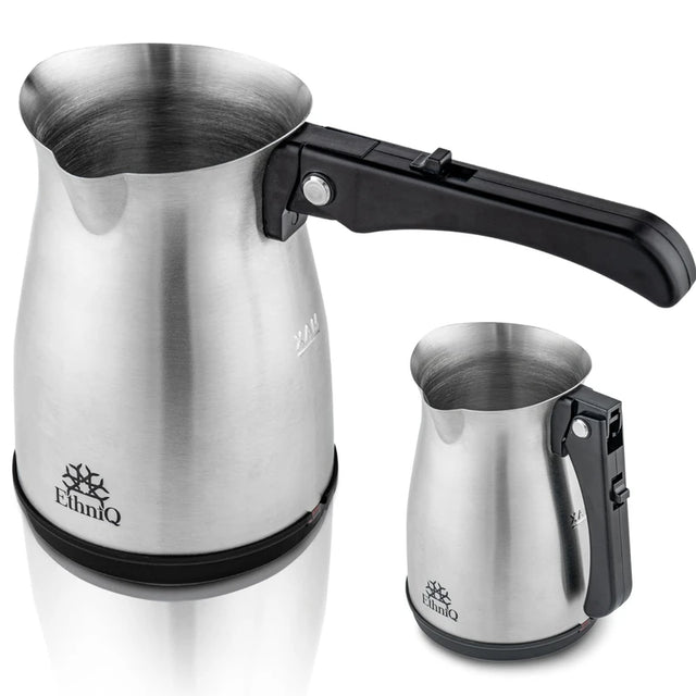ETHNIQ Turkish Coffee Pot - Stainless Steel, 120V, 1 to 4 Cup Capacity, Fast Brewing, Delicious Cup of Turkish, Arabic & Greek Coffee Maker with Foldable Handle for Home & Travel & on-off Button