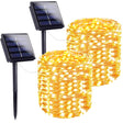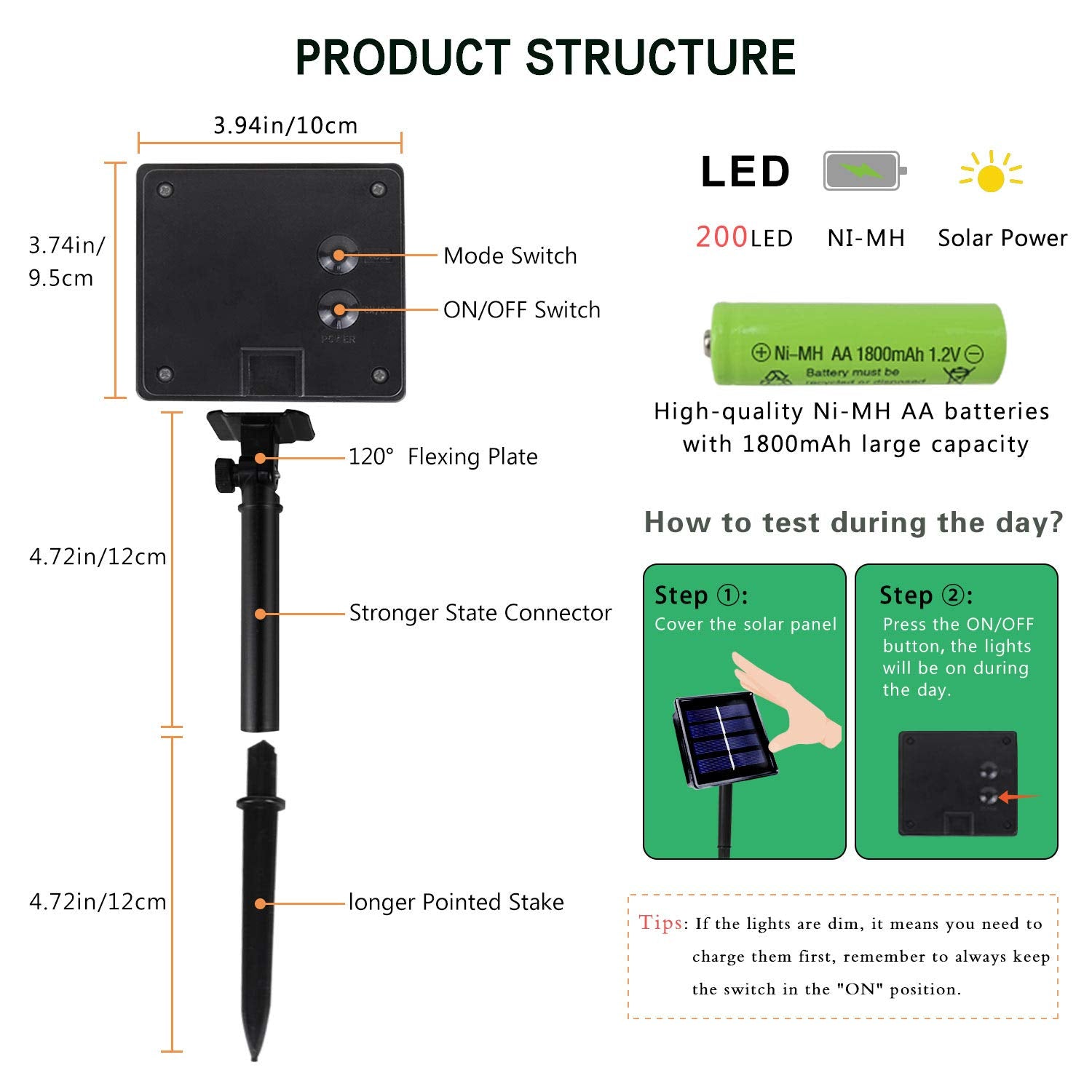 - Super Bright Solar Christmas String Lights Outdoor: 2-pack each 72ft 200LED solar string lights with upgraded LED bulbs, higher conversion efficiency with a larger size solar panel, larger capacity battery (1800mAh), and IP65 waterproof performance. The solar Christmas fairy lights emit a warm, inviting glow, creating the perfect atmosphere for a tree, wedding, Christmas, or party