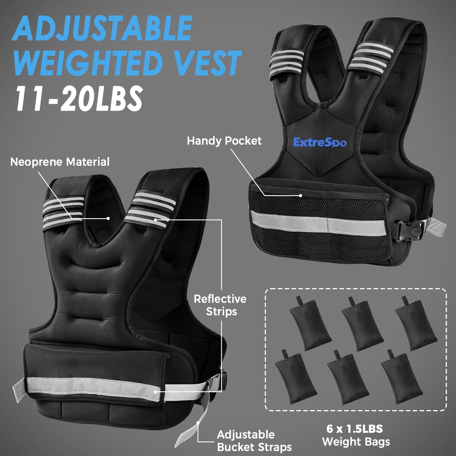 - ADJUSTABLE WEIGHTED VEST: This one-size-fits-most exercise vest by ExtreSpo weighs in at 11 pounds by itself but reaches up to 20 thanks to the included six 1.5 pound iron sand weight bags, so you can add or remove them at any time to adjust strength and efficiency as you progress