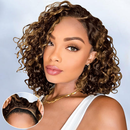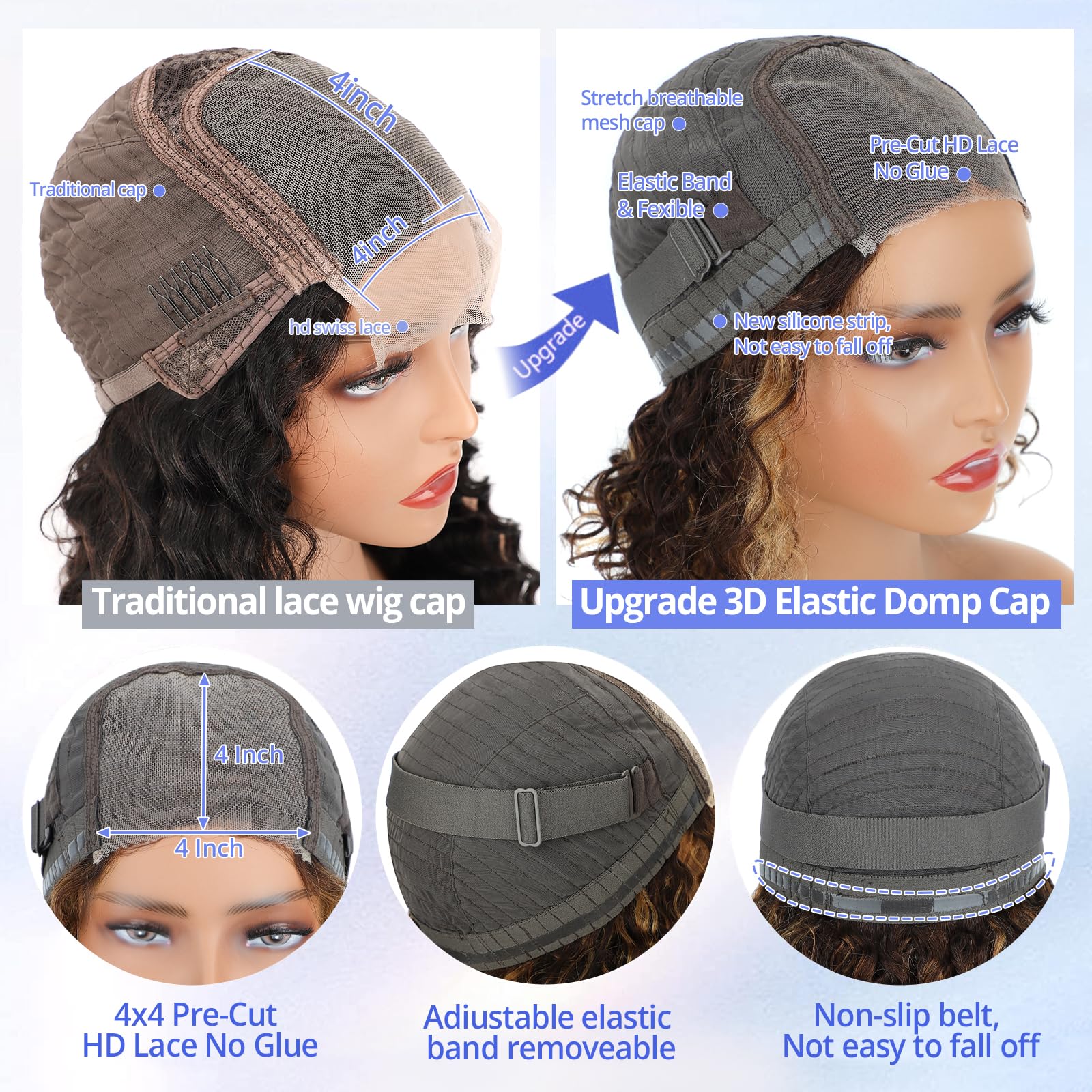 Eyefanniy Glueless Wigs Human Hair pre plucked Pre Cut Blonde Highlights Short Curly Bob Lace Front Wigs for Black Women 4x4 Lace Closure Wig with Elastic Band for Beginners 10 Inch