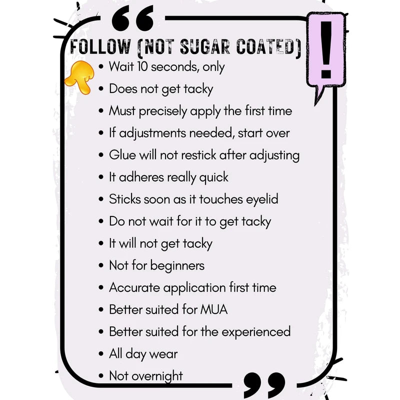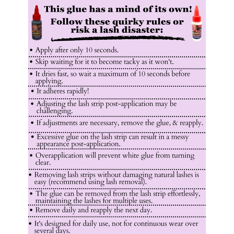- Quick-drying strip eyelash glue requires 5-10 minutes to dry once applied. White glue may take longer to clear. Avoid excess glue to prevent white residue.