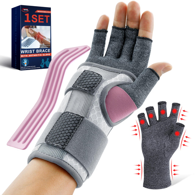- [Brace Set for Women] This set contains 1 wrist brace and 1 compression glove. Designed to help you relieve pain and keep you comfortable all day and all night. Suitable for people with carpal tunnel syndrome, pregnancy, arthritis, tendonitis, wrist sprains, strains, etc.