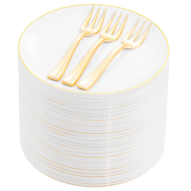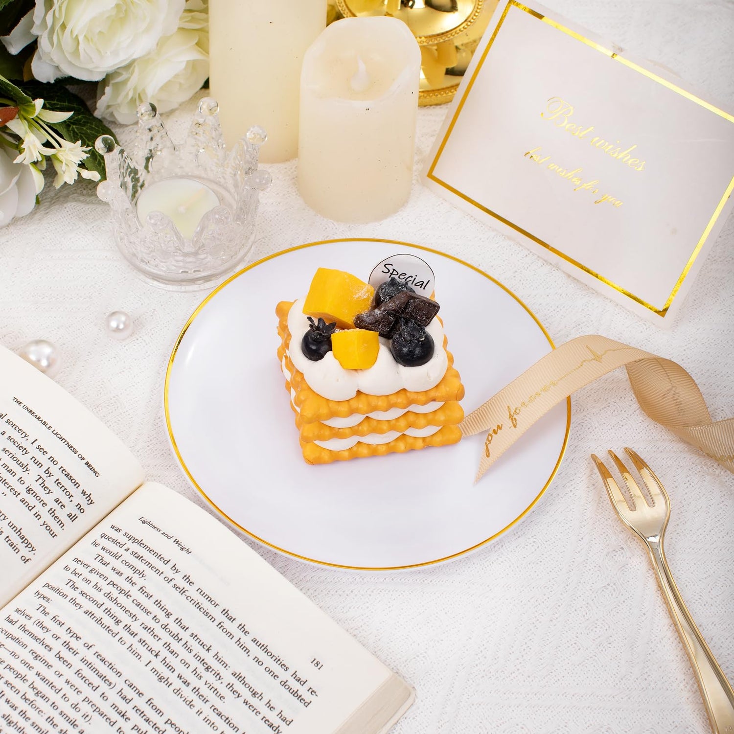- EXQUISITE&ELEGANT DESIGN: Each plastic dessert plates and fork is designed with sparkling gold color, adding a touch of brilliance to your table, creating a gorgeous yet classy dining atmosphere and allowing guests to experience a feeling of dignity.
