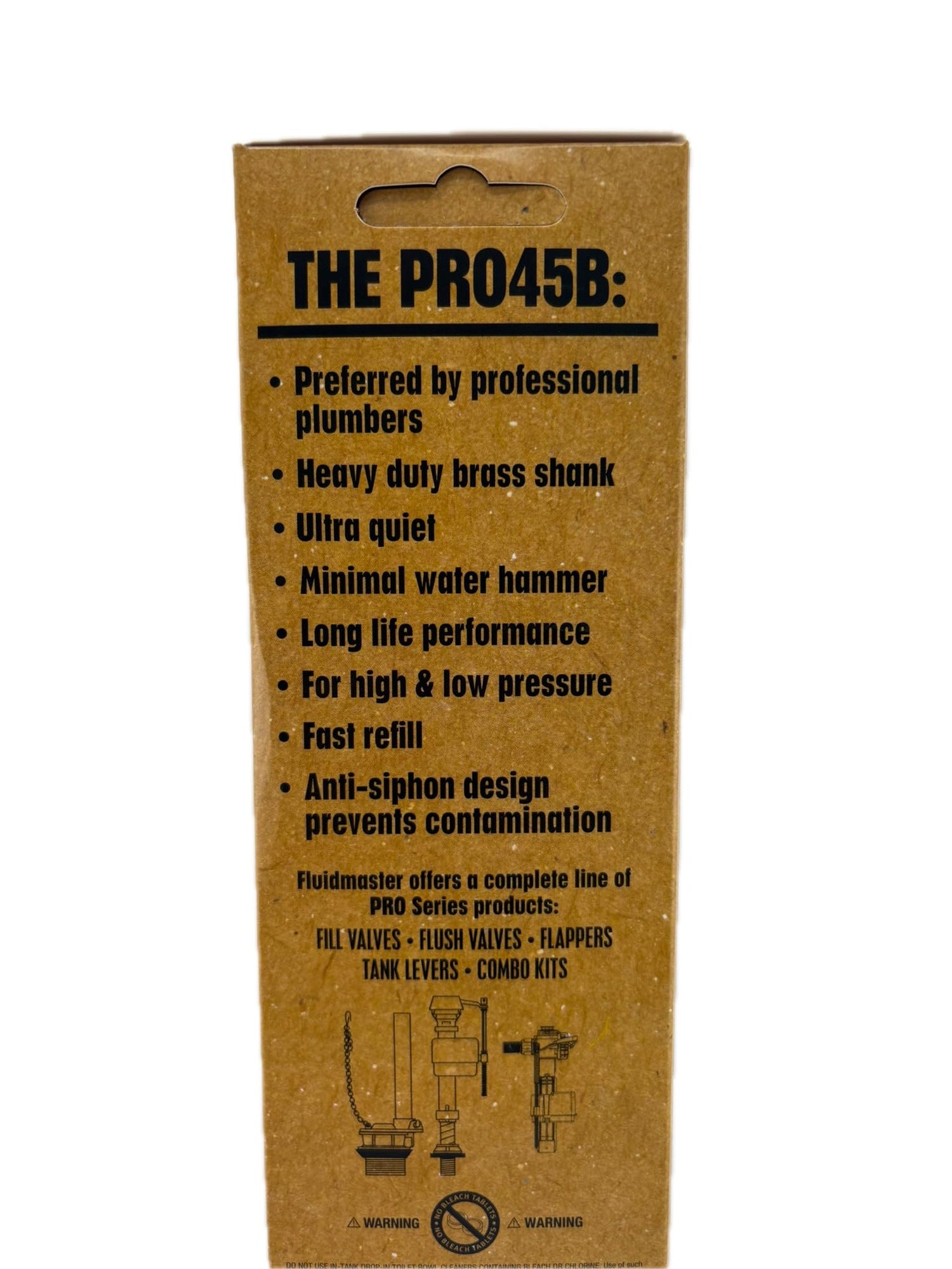 Details: Fluid master PRO45B has a heavy duty brass shank that won’t crack, corrode or strip. While it’s tough on the outside, it’s quiet on the inside. The special shank cuts down on noise and makes water hammer go away. Preferred by professional plumbers. Heavy-duty brass shank. Brass shank for added durability. Ultra-quiet operation. Minimal water hammer. Code approved. Easy to Install. Fits All Brands. 5-Year Warranty.