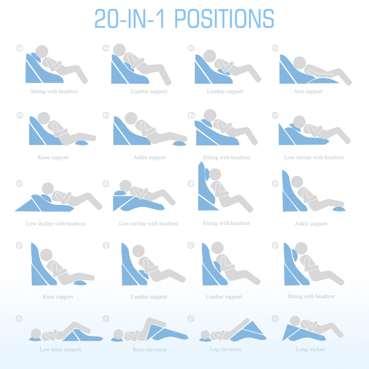 - 20-IN-1 VERSATILE DESIGN: The bed wedge is available in 20 combinations and adjustable height options to meet individual requirements for different sleeping positions and needs, and can be used as a headboard, head support, back support or leg pillow. Bed pillow wedge promote spine health, relieve muscle tension, and ensure comfortable relaxation, and can be used not only for sleeping, but also for leisure activities such as watching TV or reading.