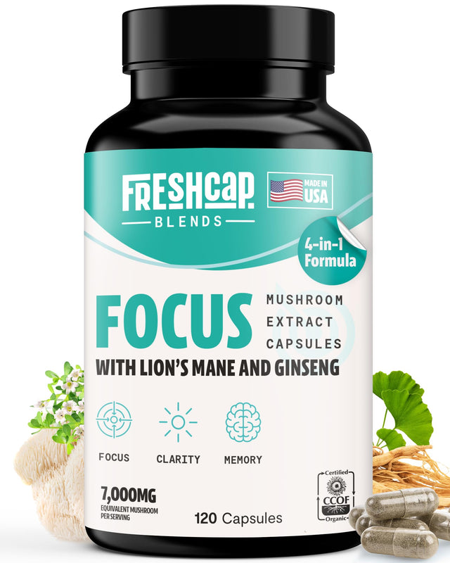 FreshCap 4-in-1 Focus Supplement - Supplements for Memory and Focus - Memory Supplement for Brain, Brain Booster Supplement, Lions Mane Extract, Ayurveda Ginseng (120 Capsules)