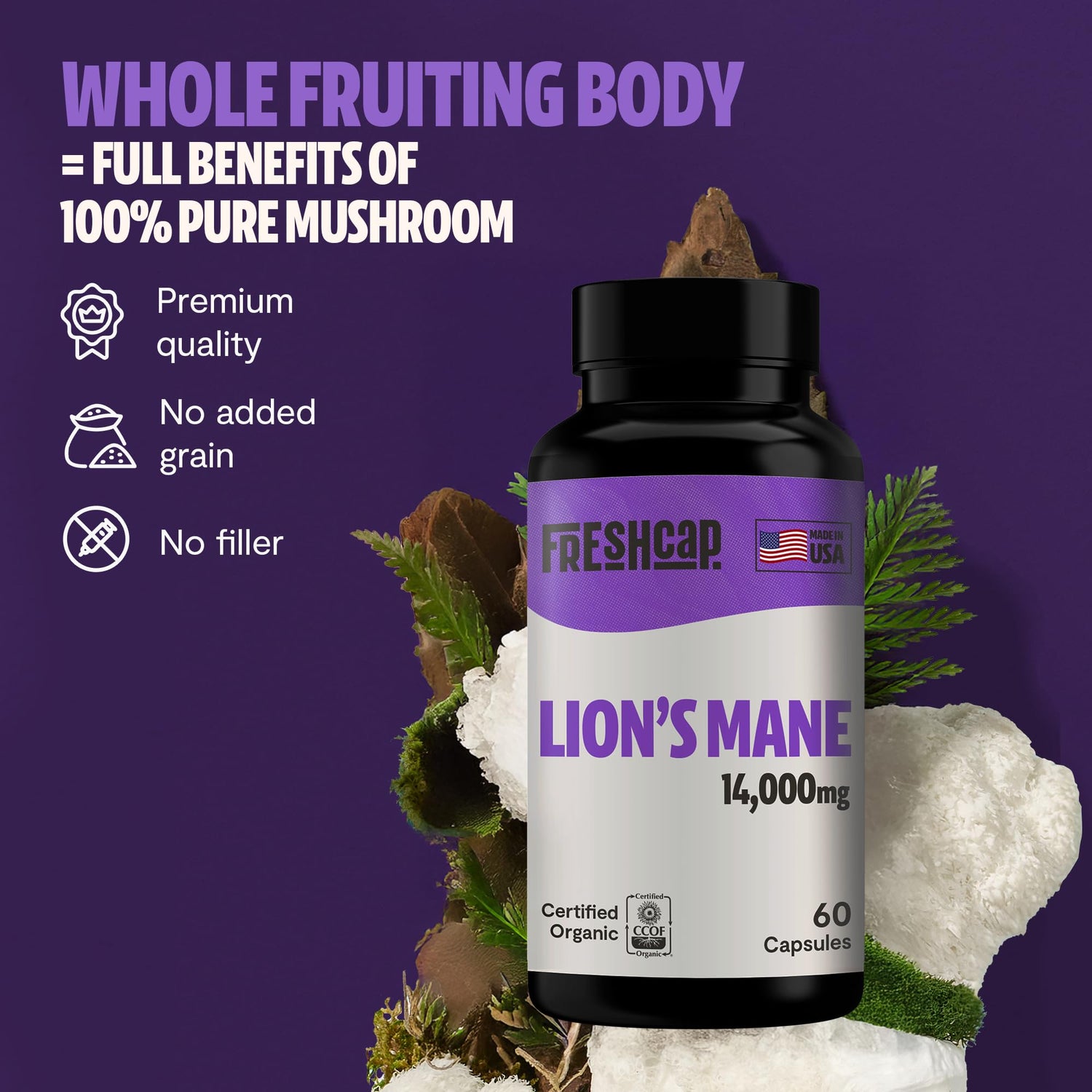 FreshCap Lions Mane Supplement Capsules 14,000mg - Lion's Mane Mushroom Extract for Brain Support, Premium Ayurveda Organic LionsMane Mushroom for Memory, Focus & Clarity (180 Capsules) is backordered and will ship as soon as it is back in stock.