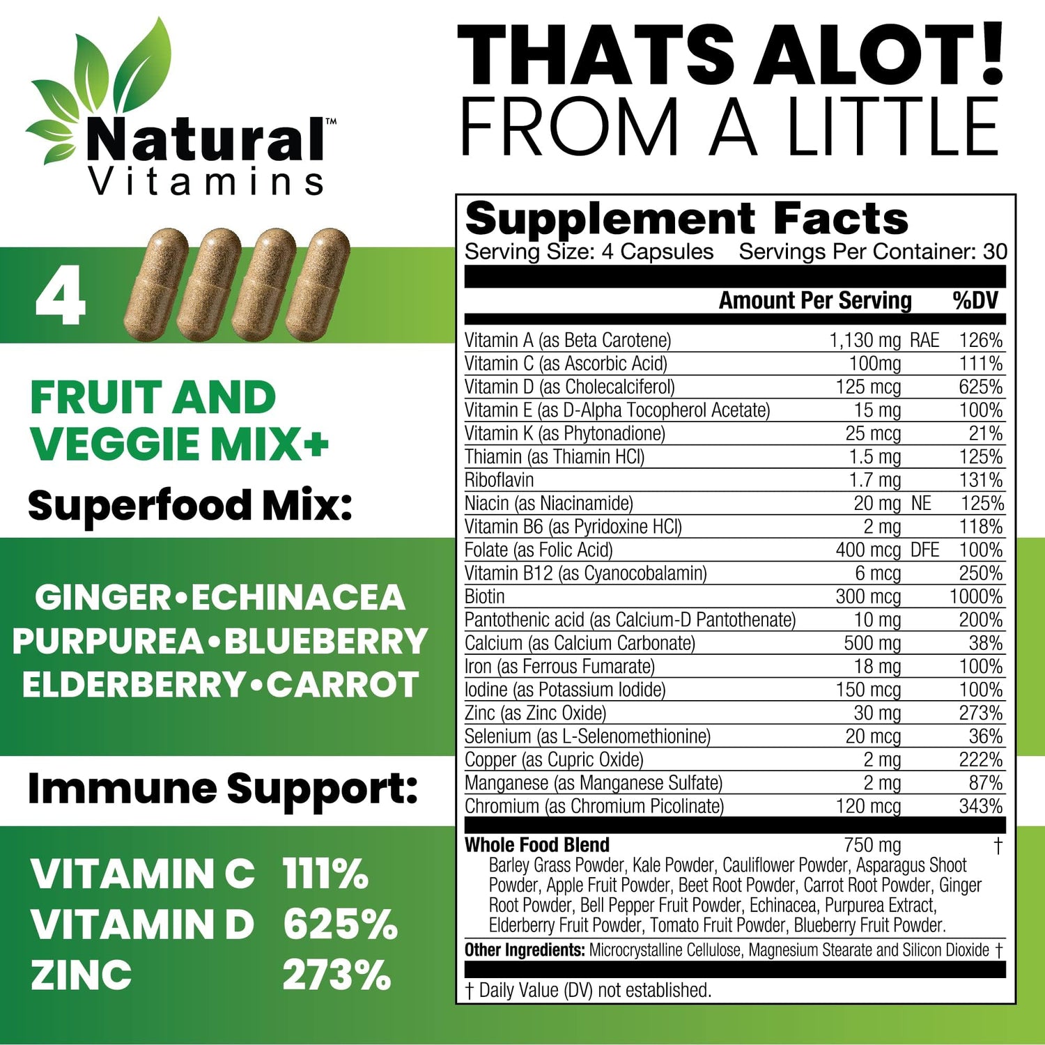 - CONVENIENT TOTAL DIETARY SUPPLEMENT & NO BAD TASTE: Adding our fruits and veggies immune support & multivitamin to your diet is a fast and easy way to becoming a healthier, happier and more energetic version of yourself. If you currently don't consume the recommended five fruits and vegetables each day, Natural Vitamins is a perfect fit