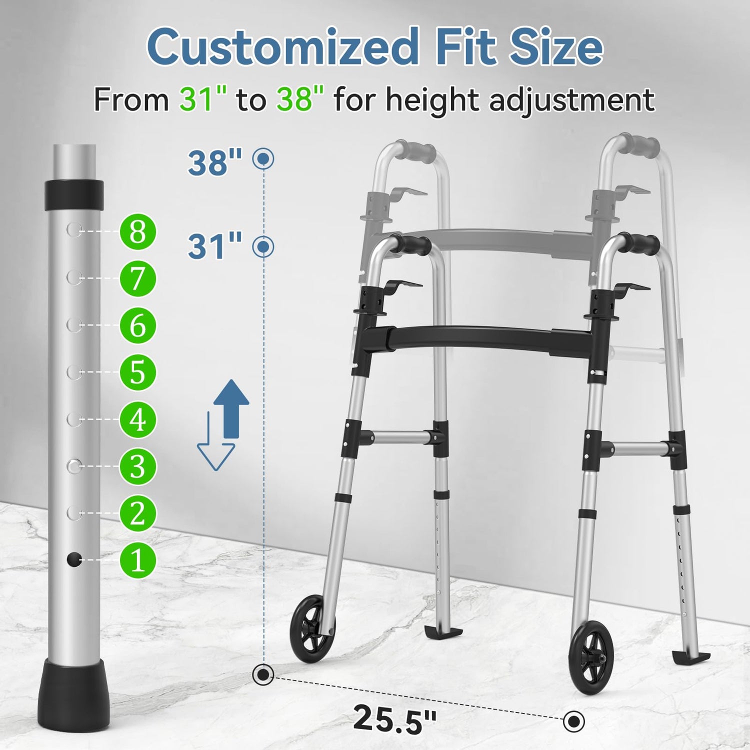 - Accommodates User Heights: Easily adjust the height from 32" to 38". Setting the walker to the correct height ensures your arms rest comfortably on the handles, promoting a natural and relaxed position