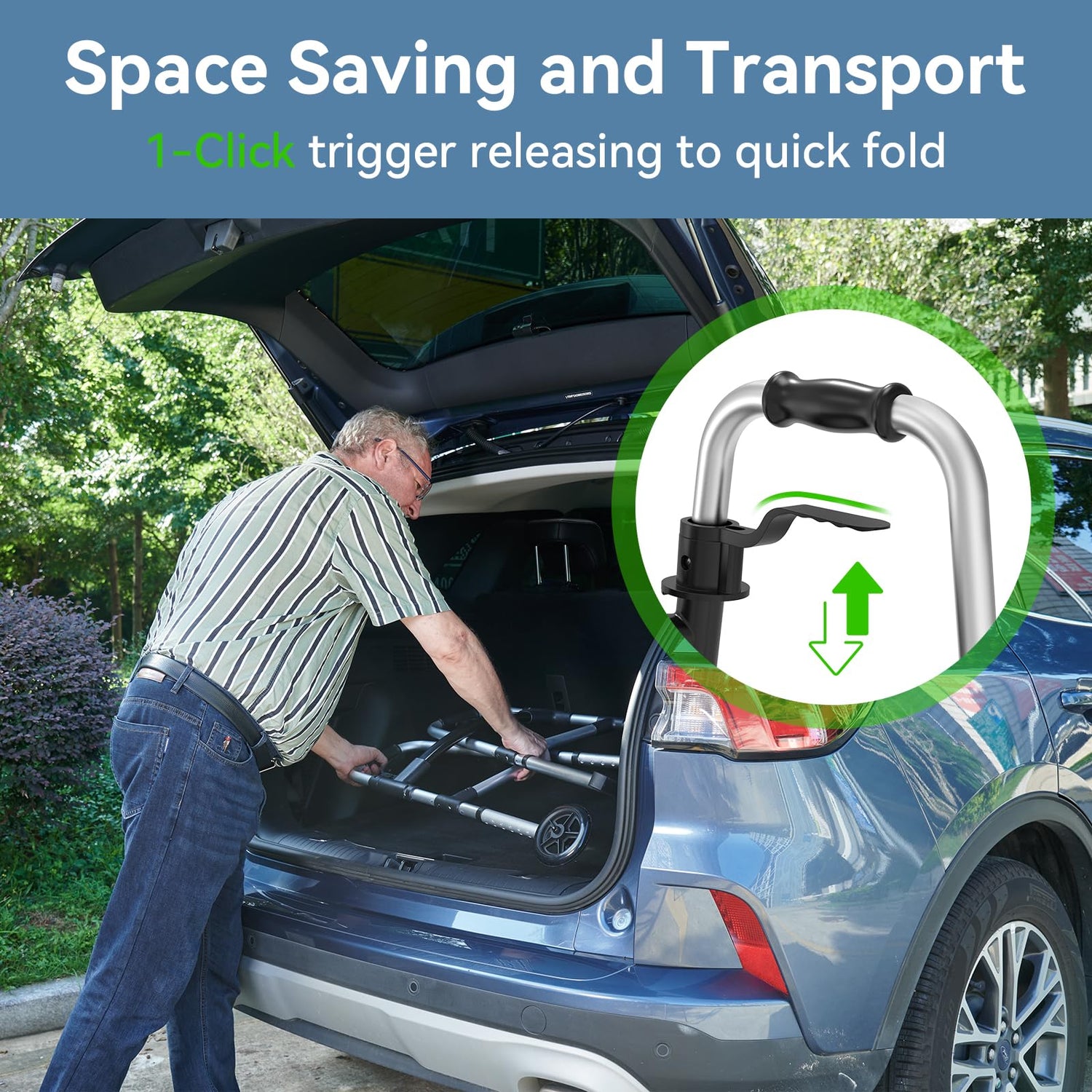 - Space Saving and Transport: The trigger release mechanism ensures effortless operation, making it easy to fold and transport. This compact walker fits in a car trunk or can be stored in a corner of a room