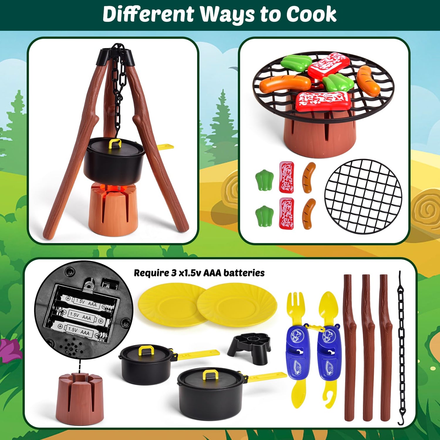- VALUE SET: This camping set toy for kids comes with a tent and different camp-related tools and accessories. It includes a wristwatch, oil lamp, three sticks and pots, grilling accessories, tools, 6 pretend play food.