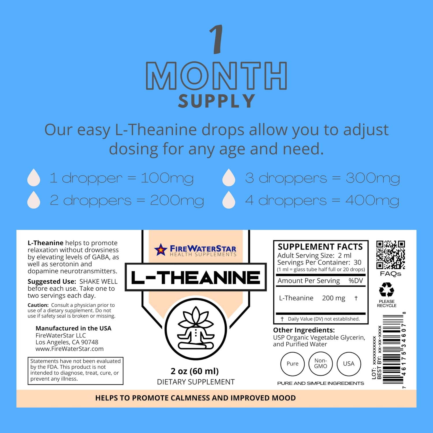 - PURE AND SIMPLE INGREDIENTS - Our L-Theanine is manufactured in the USA and is packaged in glass dropper bottles to ensure top quality. Our L-Theanine consists of USP 99% pure L-Theanine, USP organic vegetable glycerin and purified water. The organic vegetable glycerin we use is derived from non-gmo palms and has a naturally sweet taste. That's it... we do not include any sugars, unnecessary flavors or artificial ingredients.