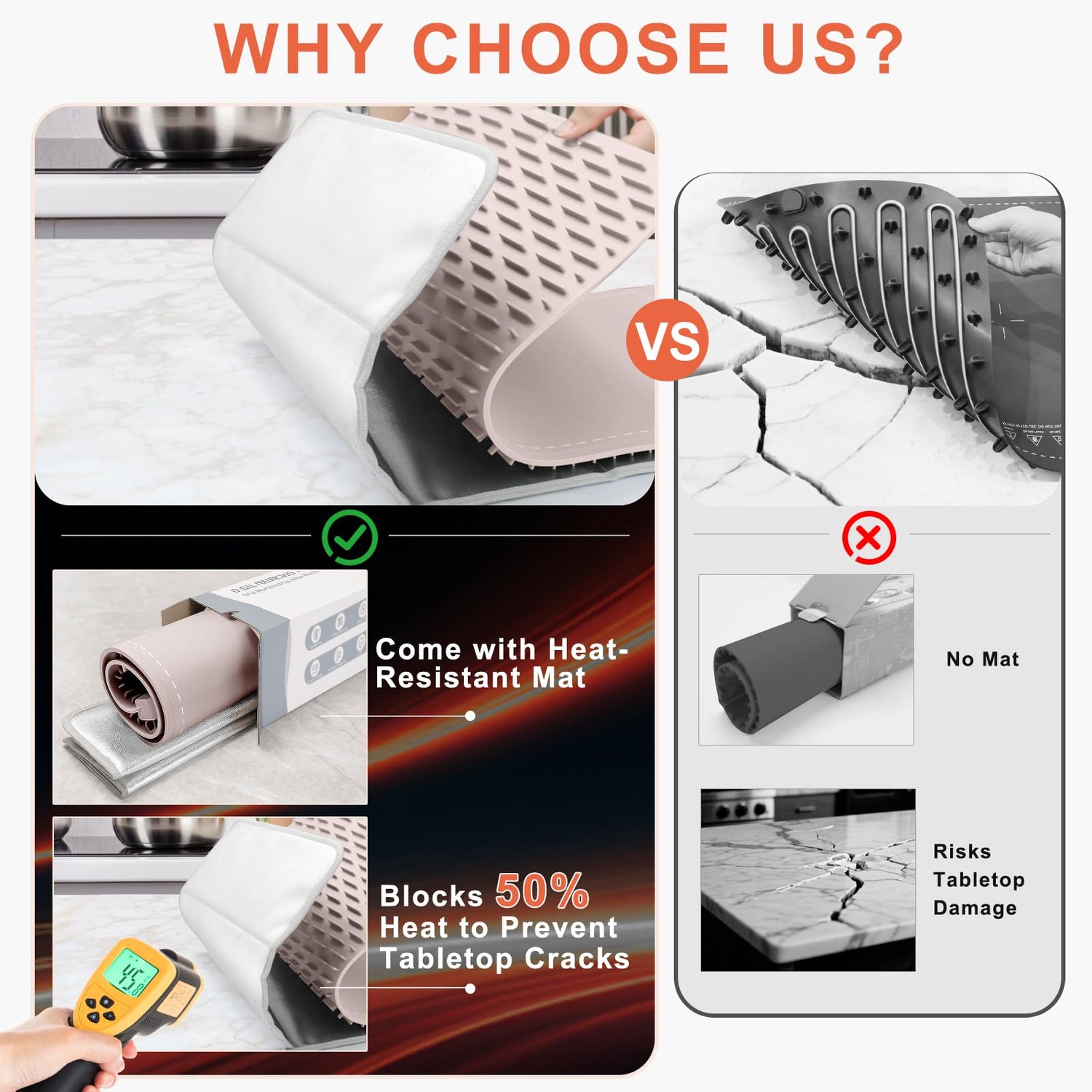 - Why Choose Us? Concerned about tabletop cracking? Our FYY Food Warming Mat included super heat-resistant mat blocks up to 50% of heat, safeguarding heat-sensitive granite, marble or wood surfaces from cracks and damage. (Note: When using this product on heat-sensitive countertops, always place a heat-insulating pad underneath to prevent the countertop from cracking due to excessive heat.)
