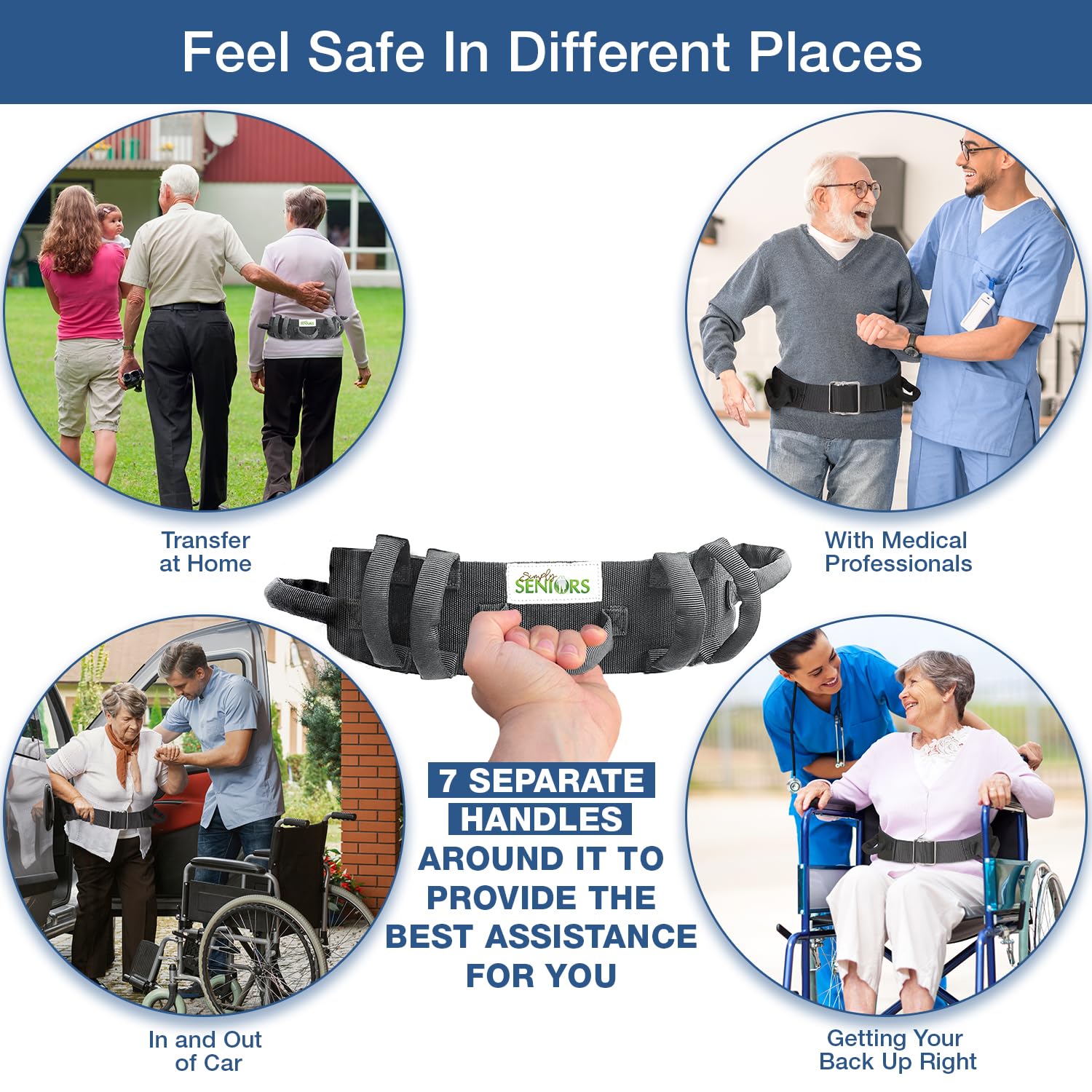 - 🌍 THE BEST ASSISTANCE EVERYWHERE! This extremely durable gait belt has 7 separate handles around it for caregivers to provide the best assistance to you, thus giving a sense of assurance and helping you with your balance and weakness issues in different places: transfers at home, with medical professionals, physical therapy, in and out of the car, in and out of a pool or getting your back upright when you can get back into your wheelchair