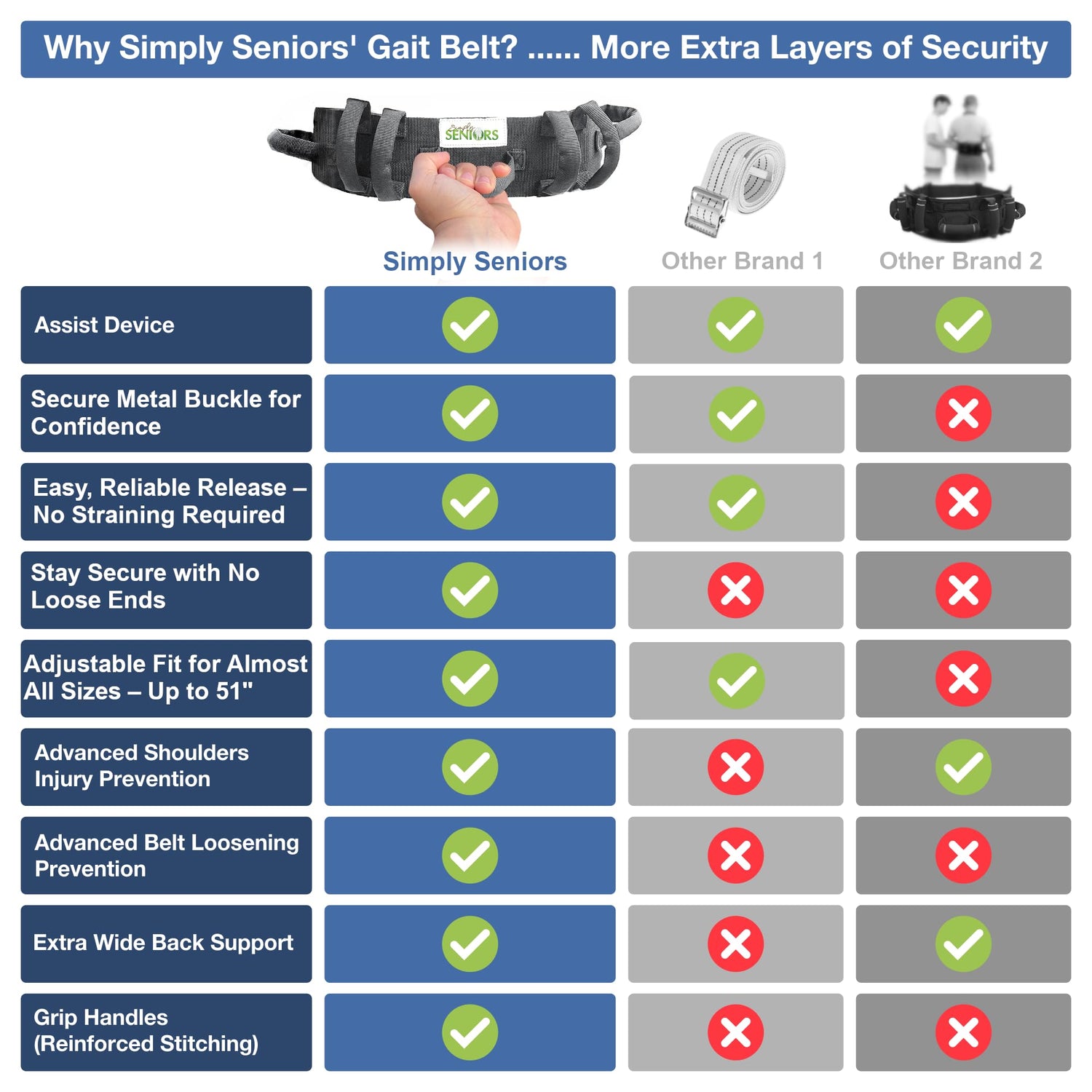 - 🛡️ INCREASED SAFETY WITH A SECURE METAL BUCKLE: The quick release metal buckle of this gait belt provides a strong, reliable closure, ensuring the belt stays secure even during heavy-duty use. This reduces the risk of accidental slippage, offering added security and peace of mind for both your caregiver and you. Your safety is a priority when using this gate belt!