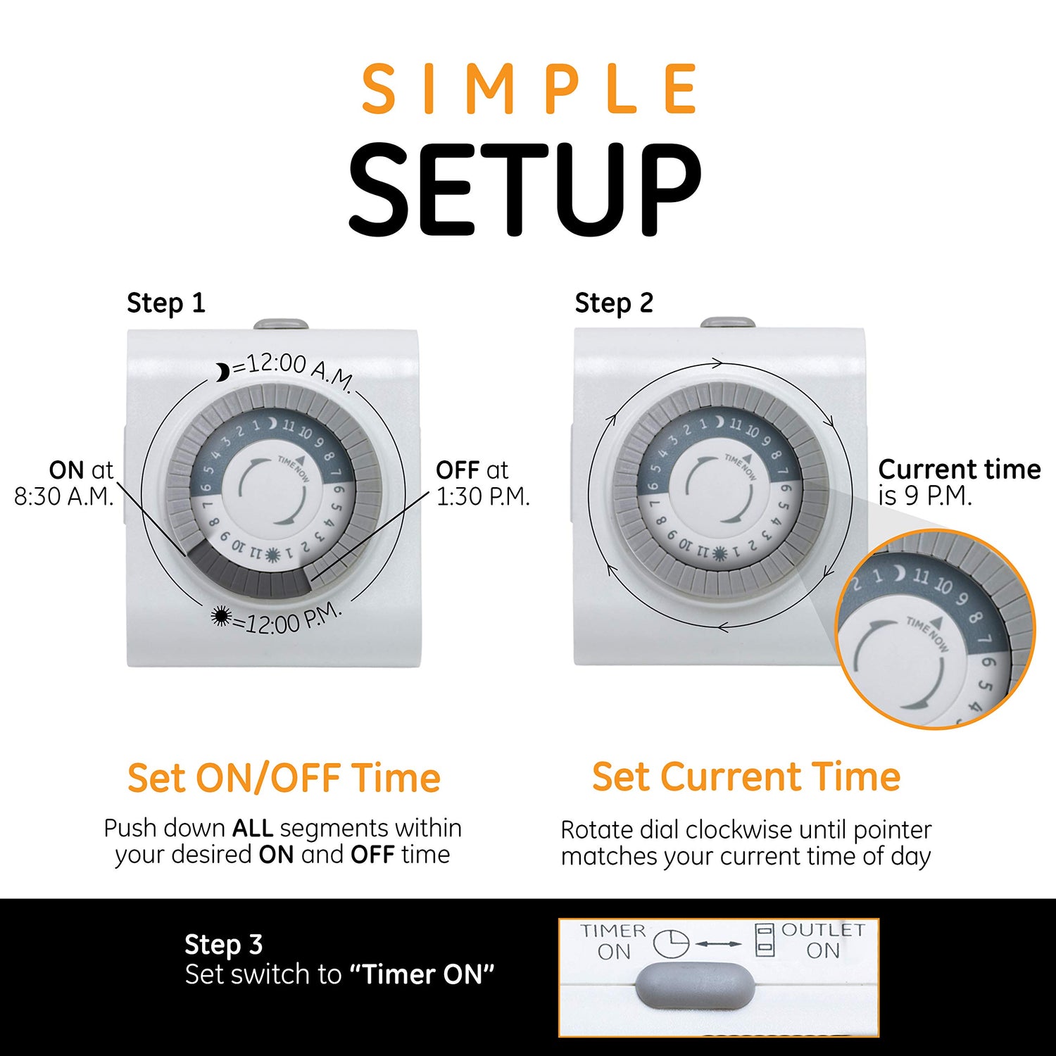 - Daily timer – 24-hour cycle provides daily control of plug-in lights, seasonal decor, holiday lighting, fans and more