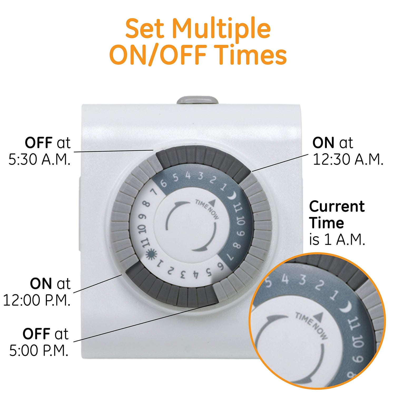 Details: Schedule your day with the GE-branded 24-Hour Heavy-Duty 2-Outlet Plug-in Mechanical Timer four pack. The easy-to-use timer is perfect for lamps, fans, small appliances and more. Add the timer to your seasonal lighting, Christmas tree or other holiday decorations to simplify the festivities. For increased versatility, it is compatible with LED, CFL and incandescent bulbs. A sleek white finish and discreet design blends into surroundings to allow placement anywhere in your home. Turn your devices ON/OFF several times throughout the day using 30-minute interval pushpins. A simple dial on the face of the timer supports less complicated set up compared to complex smart plugs. The timer turns any indoor receptacle into two timed, grounded outlets, which support lights or small appliances with three-prong cords. A side-access design directs cords along the wall to allow placement behind furniture or in other tight spaces. It also features a convenient override switch to prevent settings from cycling when not needed. Automate your outlet with the GE-branded 24-Hour Heavy-Duty 2-Outlet Plug-in Mechanical Timer four pack.