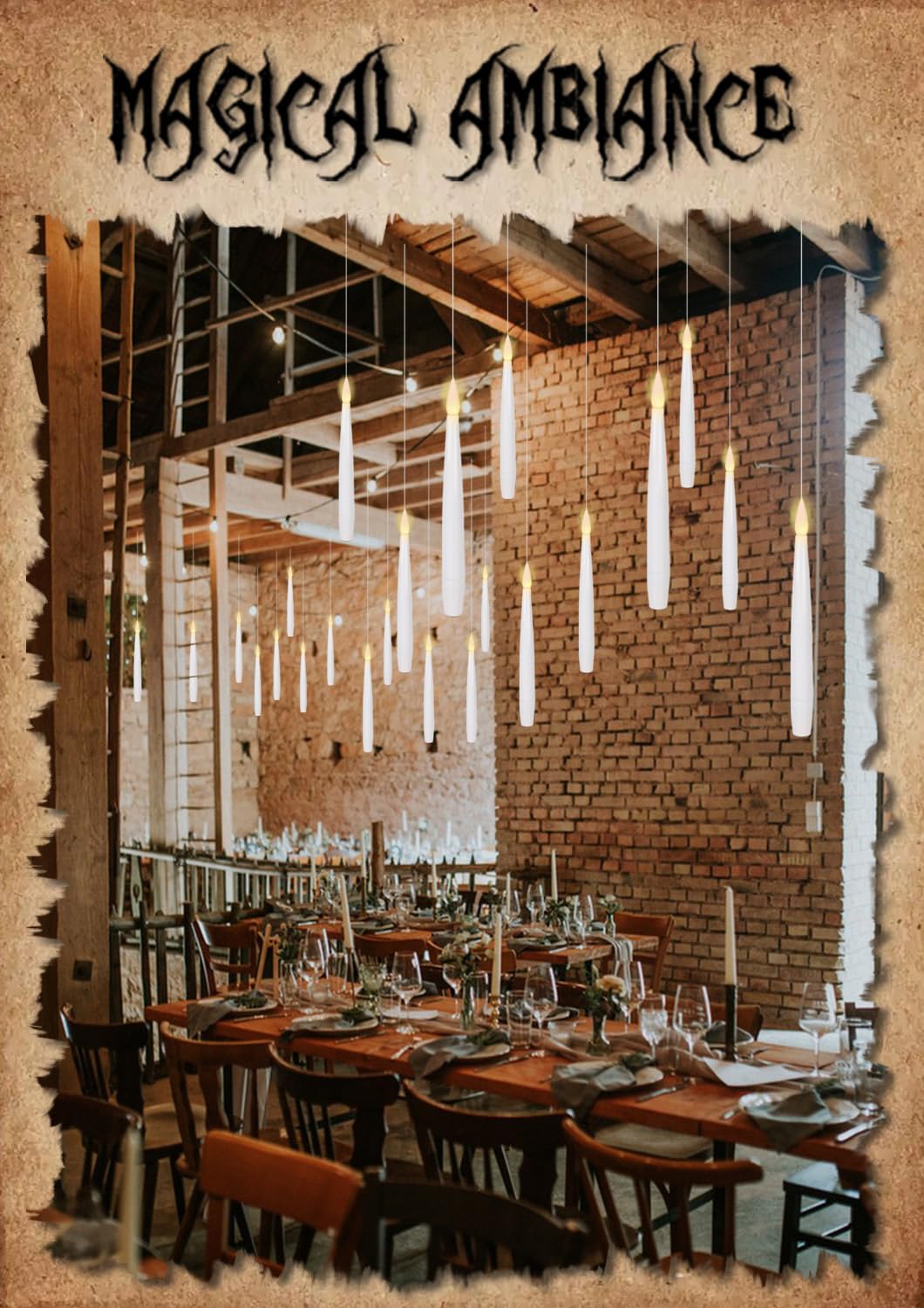 - Hanging candles for Halloween Decoration: This set of flameless candles is equipped with a 4.9ft fishing line(barely visible) pre-attached to these LED taper candles ready to hang. you can easily cut the length you like and thread it through the top, making it easy to hang straight and even. Perfect Halloween decor for holidays, church services, window candles, the fireplace, table, home & outdoor decoration.