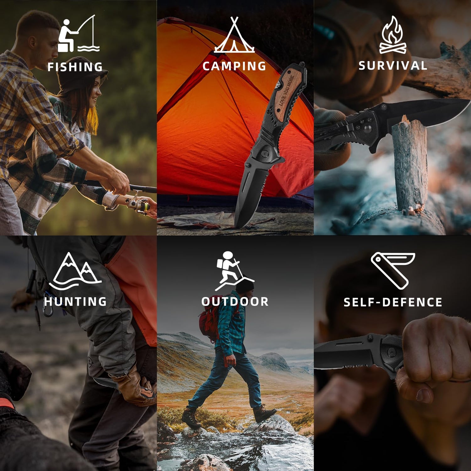 Gifts for Him Men Husband, Christmas Stocking Stuffers, Anniversary Birthday Gifts ideas for Him, Engraved Pocket Knife, Wooden Handle Folding Knife with Wood Box, Unique Outdoor Camping Hiking Tool