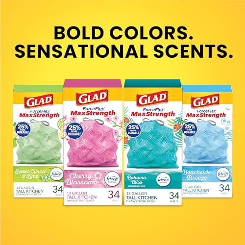 Details: Glad ForceFlex MaxStrength Drawstring Tall Kitchen Trash Bags provide maximum strength and help you fight kitchen odors with the steady release of Beachside Breeze with Febreze freshness. Featuring double-sided seals and a reinforced bottom, these 13 gallon tall kitchen trash bags are 25% more durable* with an outer leak protection layer and an inner layer that stretches to prevent rips and tears. Each of these scented trash bags features a durable grips-the-can drawstring that ensures the bag won't slide down and makes it simple to close with a quick cinch. Once closed, the drawstring keeps the trash securely inside the bag to minimize spills and prevent messy trash disasters. The sturdy handle makes it easy to lift, carry and toss these Glad kitchen trash bags. Each bag measures 1 foot 11 15/32 inches by 2 feet 1 3/8 inches, so it's just the right size for most kitchen garbage cans. These drawstring trash bags are great for a variety of other uses around your home or office, whether you're tackling seasonal cleaning tasks or cleaning out your desk. It's better than all good. It's all Glad. * vs. Glad 13 gallon ForceFlex bag
