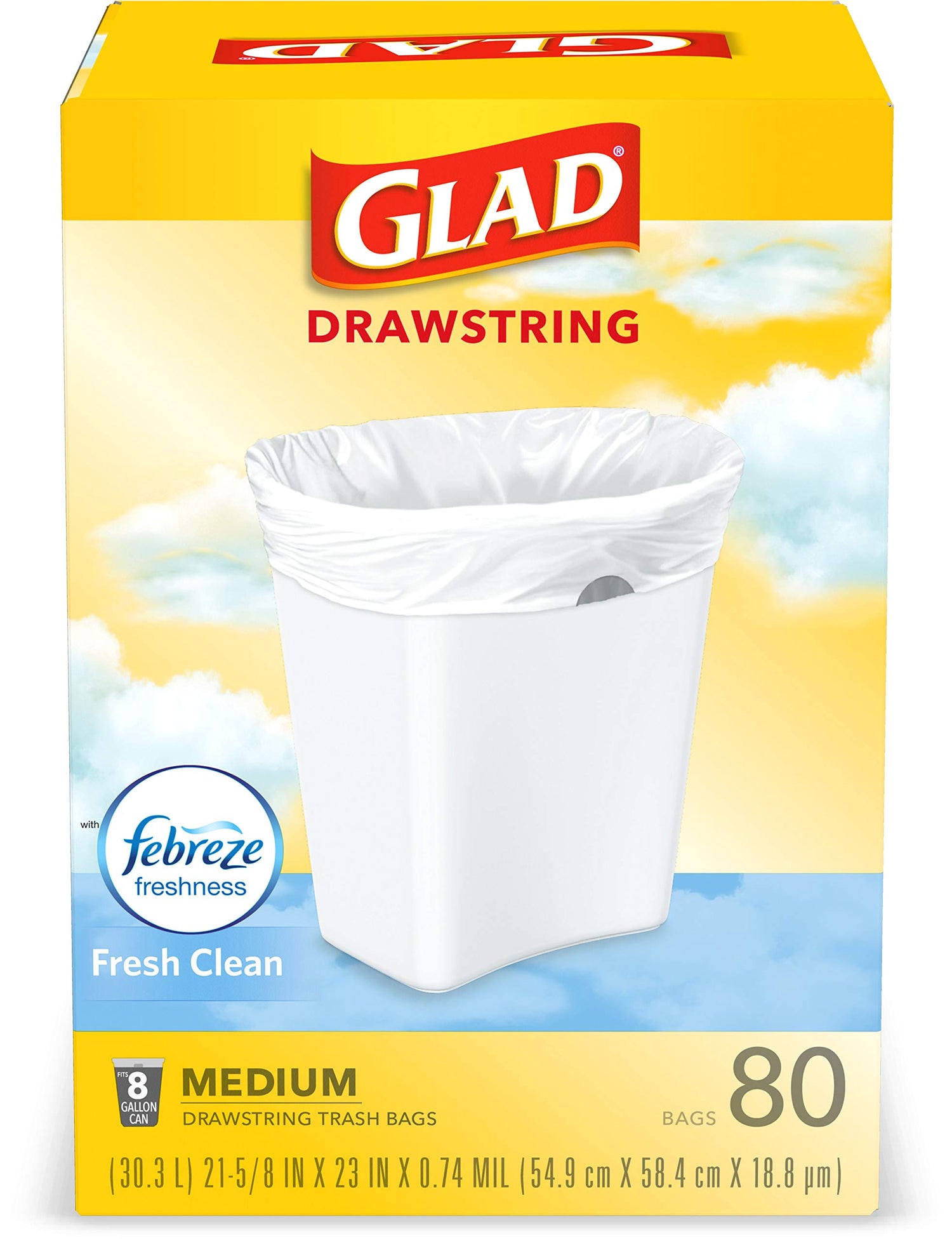 Details: Glad Drawstring Medium Scented Trash Bags provide strength plus odor control using the steady release of Febreze Freshness in Fresh Clean scent. These 8 gallon trash bags help you achieve long-lasting freshness around your home by providing continuous odor neutralization. Each of these medium trash bags features a durable drawstring that makes the garbage bag easy to close with a quick cinch. Once closed, the drawstring keeps the trash securely inside the bag. Constructed to ensure leak protection, these medium garbage bags let you take out the trash frustration-free without fear of leaks and tears. Each 8-gallon trash bag measures 21 5/8 inches by 23 inches, making it just the right size for medium garbage cans around the home and office. Stock your kitchen, bedroom, bathroom, nursery and even your vehicle with these handy scented garbage bags. It's better than all good. It's all Glad.
