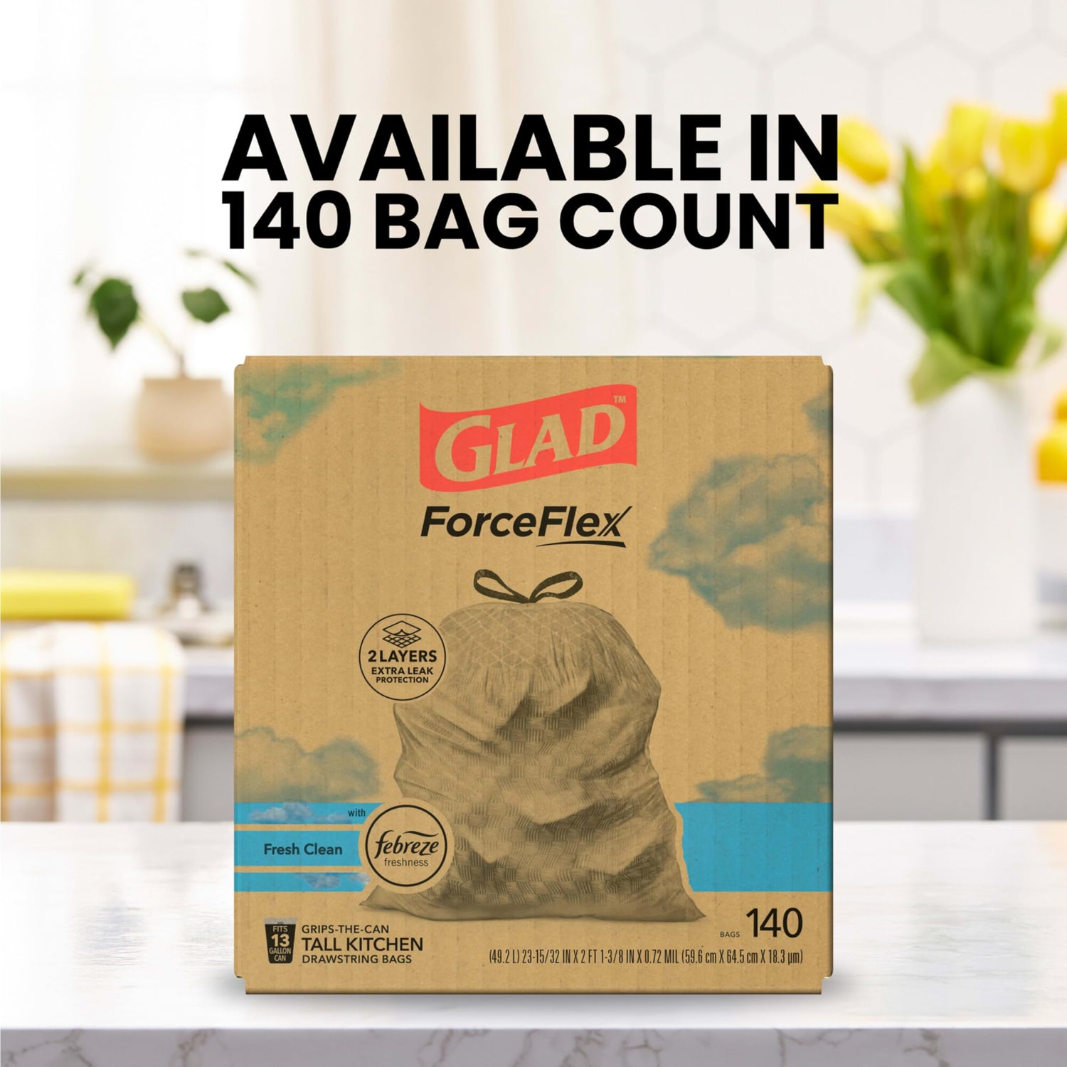 Details: Glad ForceFlexs stretchable strength handles all the messes of our busy lives and then some. Glad Tall Kitchen Drawstring Trash Bags are designed with ForceFlex technology to give extra flex as it expands around sharp edges and heavy loads. These trash bags are designed with two layers for extra leak protection. RipGuard and LeakGuard technology prevent seepage of liquids and keep trash contained. Fight nasty kitchen odors with a steady release of Febreze freshness and irresistible Gain Original scent that traps, locks and neutralizes odors. The durable Grips The Can Drawstring ensures a tight grip on the trash can. Glad trash bags are made with 100% renewable electricity (1). FEBREZE and GAIN are used under license from The Procter and Gamble Company or its affiliates. (1) For bags manufactured in US plants. All energy used is offset by virtual power purchase agreements and purchased renewable energy certificates (RECs).