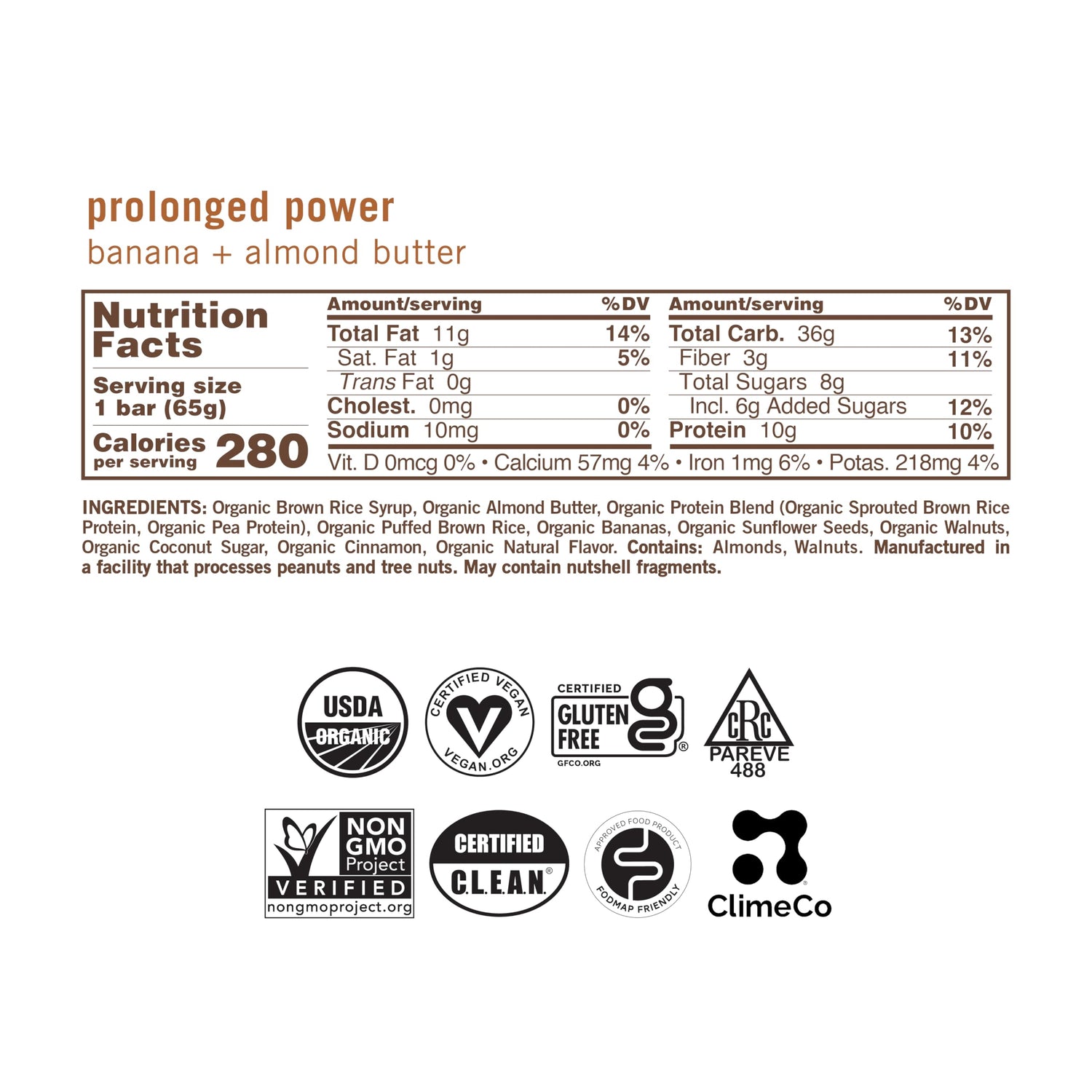 Details: As delicious and comforting as a slice of homemade banana bread, our Prolonged Power MacroBar combines the taste of real bananas, chopped walnuts, creamy organic almond butter, and a hint of cinnamon for a warming and nourishing snack. The real treat is 11g of plant-based protein plus healthy fats, iron, and potassium for a long-lasting energy boost your body craves!