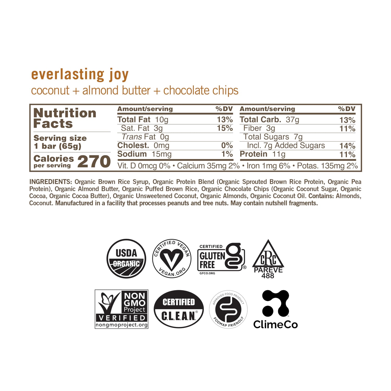 Details: Reminiscent of your favorite candy bar as a kid, this perfect balance of organic coconut, vegan dark chocolate chips, creamy almond butter, and 11 grams of plant-based protein, our Everlasting Joy MacroBar provides delicious, sustained energy to fuel your day. To top it off, a portion of the proceeds from this bar is shared with organizations fighting family hunger and homelessness.